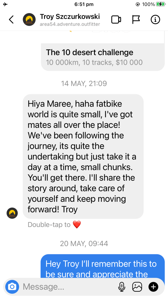 I touched base with Troy via Instagram earlier on in Mitchell. Troy is well known by fat bikers and has raced trails overseas including Alaska. He offered to share our socials through his network and it seems to have reached his followers which is awesome to get the word out for beyondblue. I often think about his encouraging words of advice to tackle each day one step at a time.