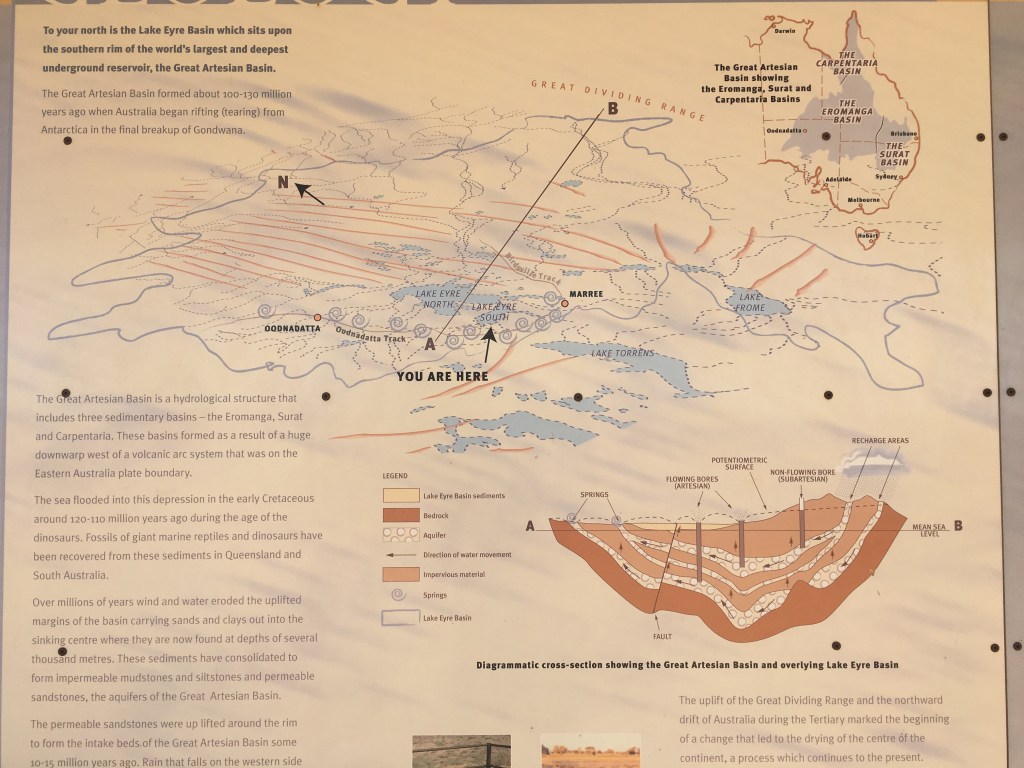 Apparently the Lake Eyre basin sits at the southern rim of the Great Artesian Basin. It’s the worlds largest and deepest underground reservoir of water that formed about 120 million years ago when Australia broke away from Antartica. The sea flooded underground and erosion caused the water to pool in the sinking central areas up to 3000m.