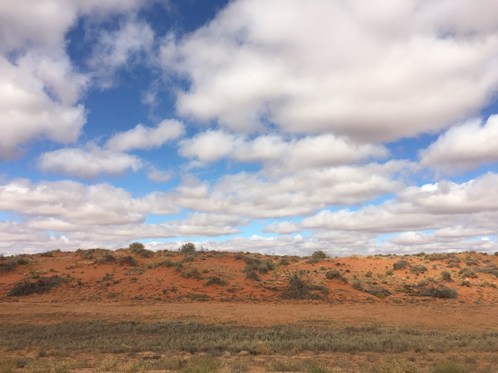 The countryside was a stunning contrast of colour with blue skies and open plains of red sand and low lying shrubs. The horizon was broken with distant rolling ranges and fluffy clouds softened the harsh corrugations. It all made the track just a bit more welcoming in the tricky conditions.