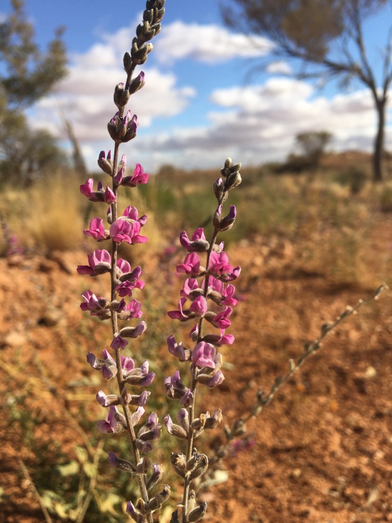 I can feel myself starting to warm to the Oodnadatta Track and appreciate its treasures. There is a variety of flowering flora amongst the sandhill cane grasses. It’s fun to try spot the more common varieties like saltbush, blue bush, samphire, frankenia and poached egg daisies. I stopped and took a photo of swainsona which has an intricate flower of purples that are precious.