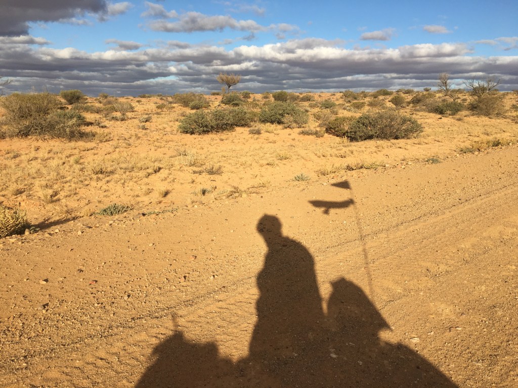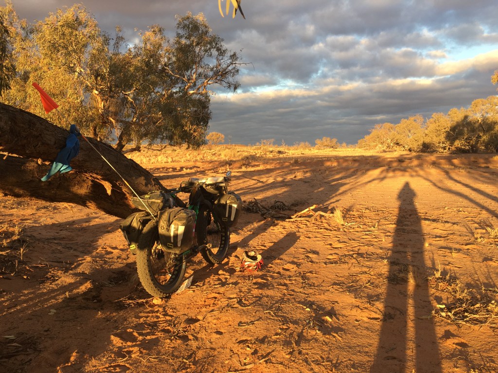 Banjos rear pannier was a bit off centre and hitting the tyres during today’s bumps and thumps so I adjusted him tonight and he’s more comfortable to tackle the corrugations and gibber stones again tomorrow. ‘Gibber’ is the name for desert stones which are hues of red and purple depending on the light.