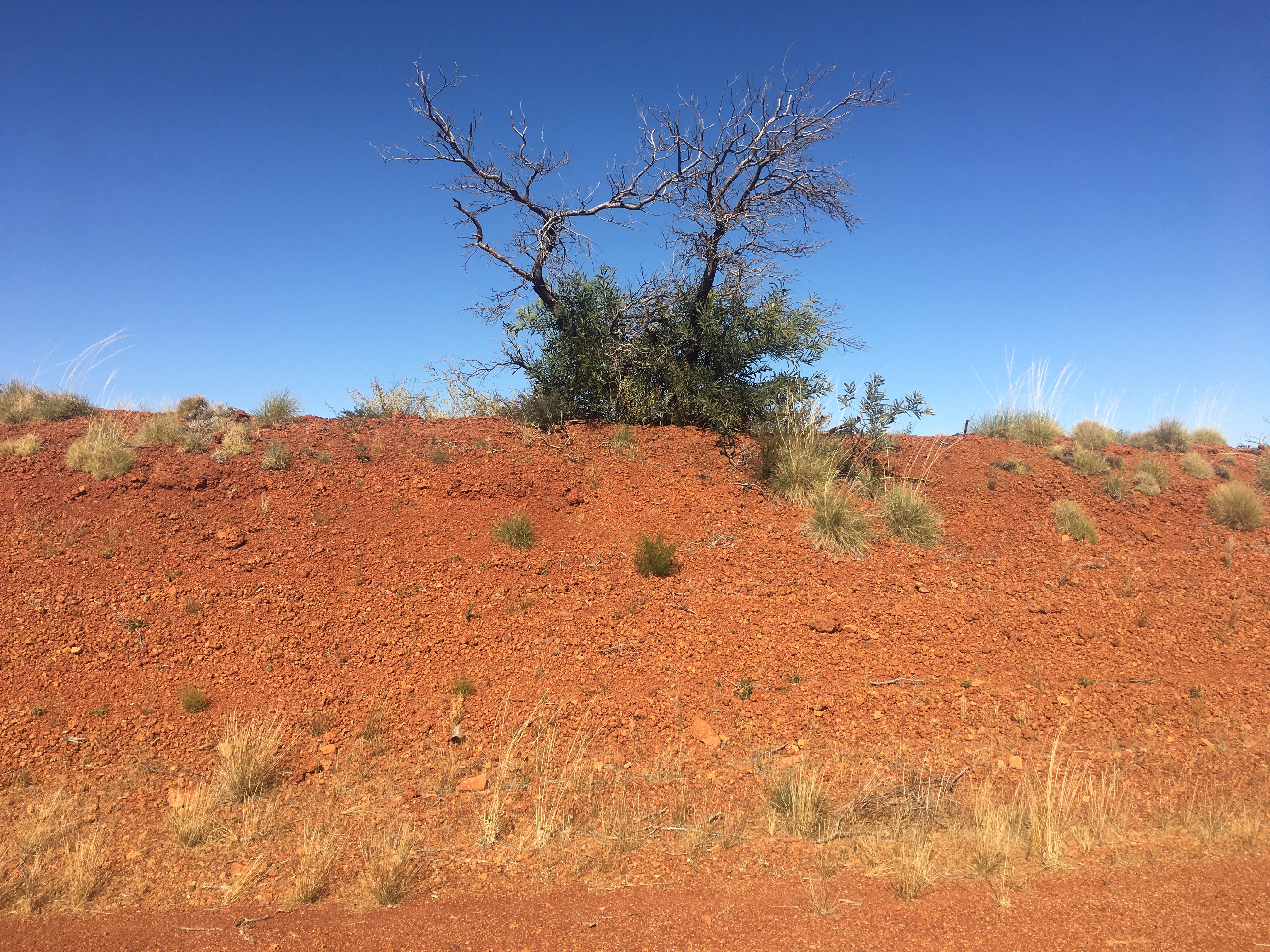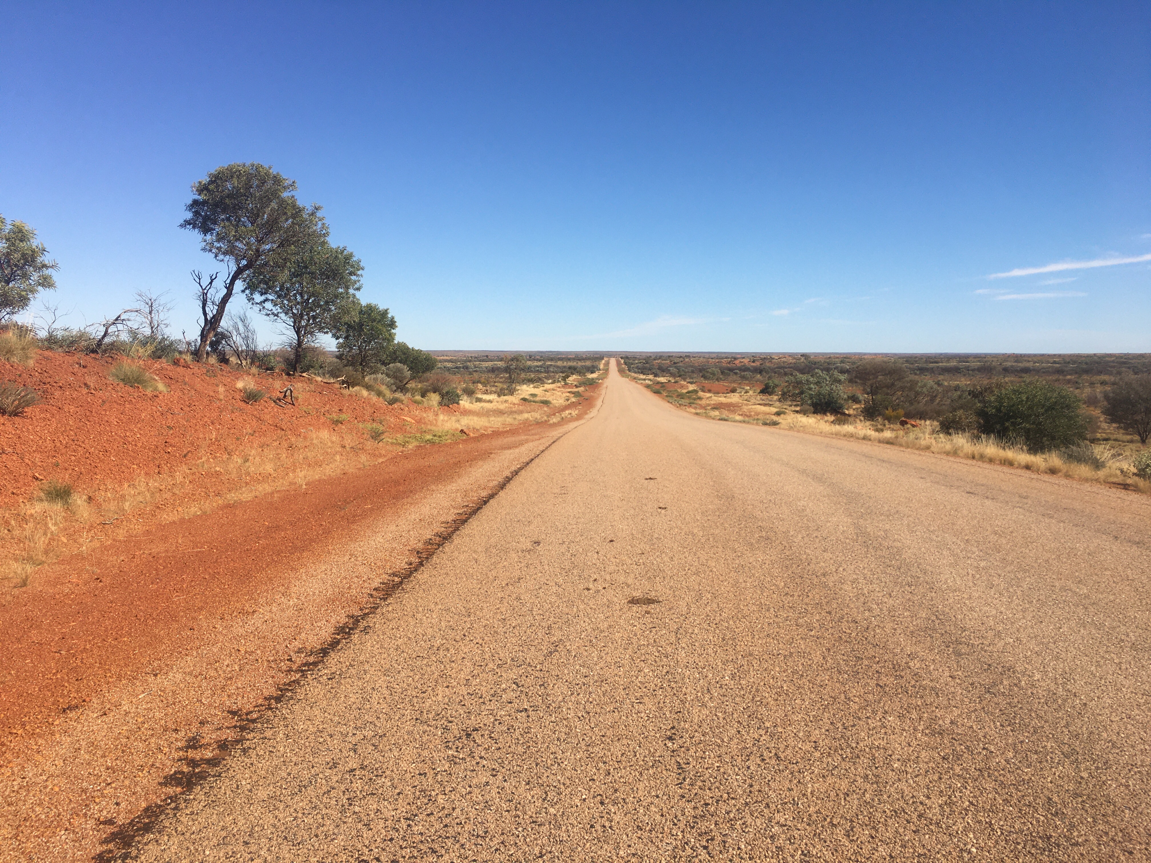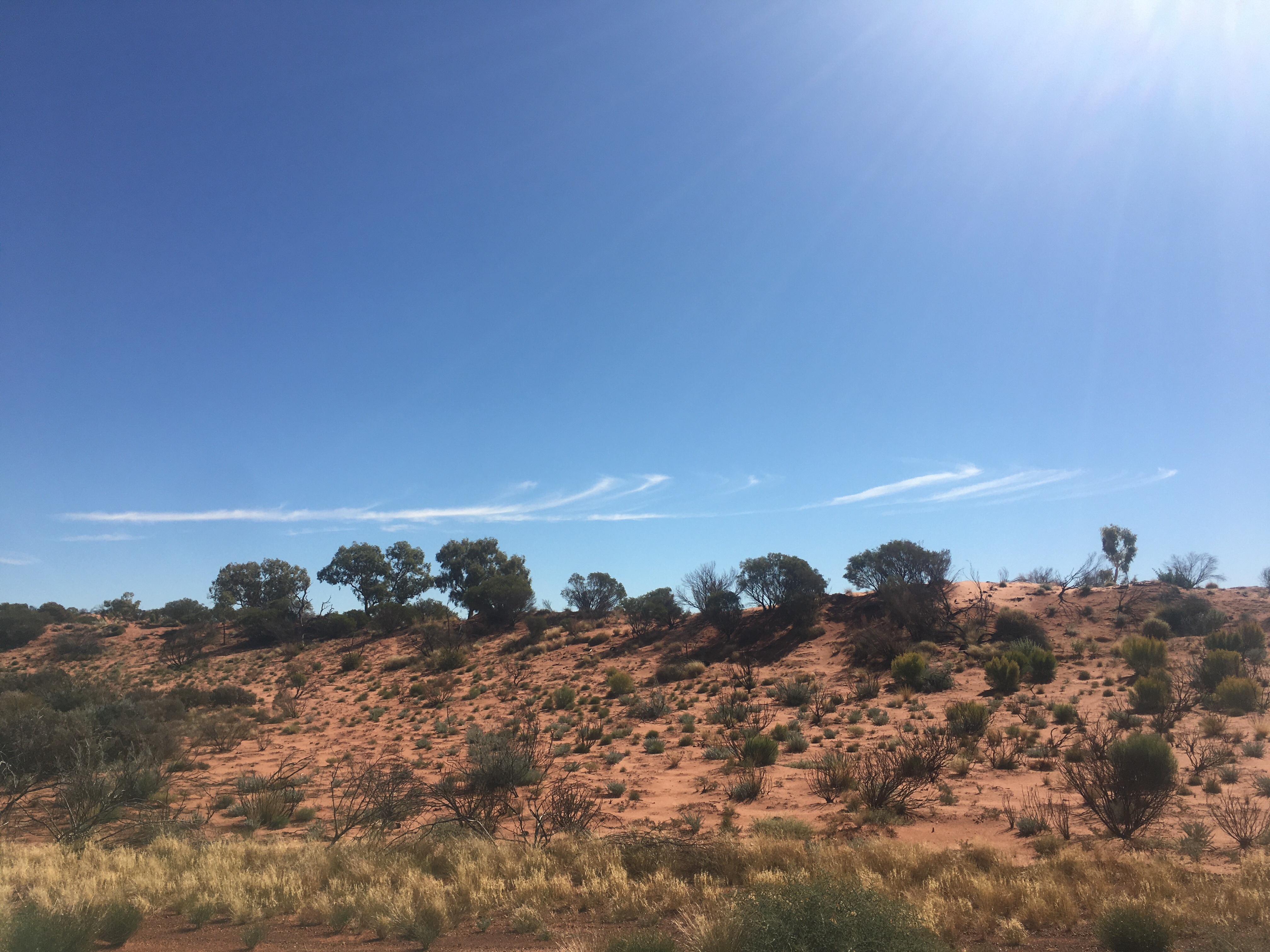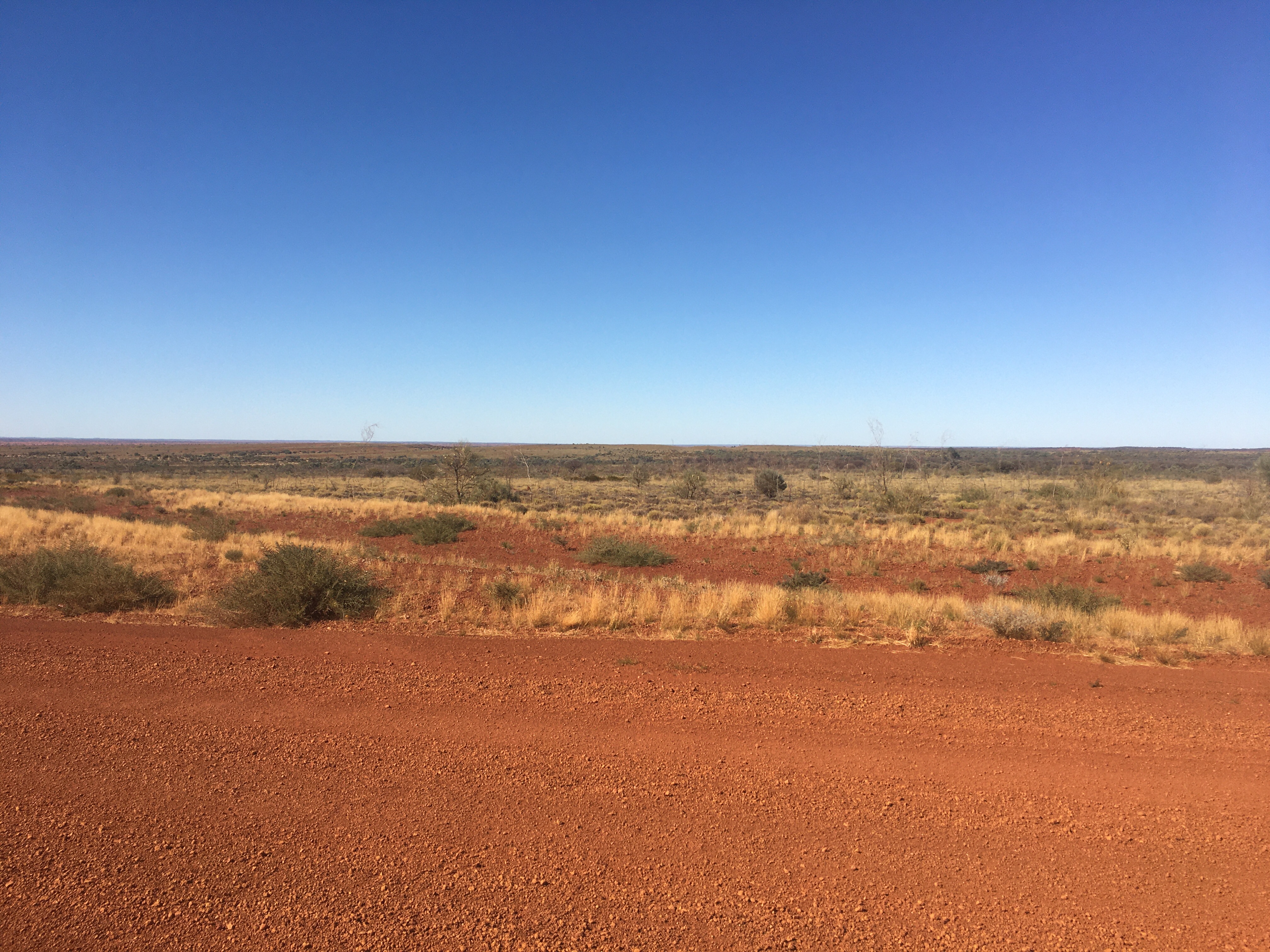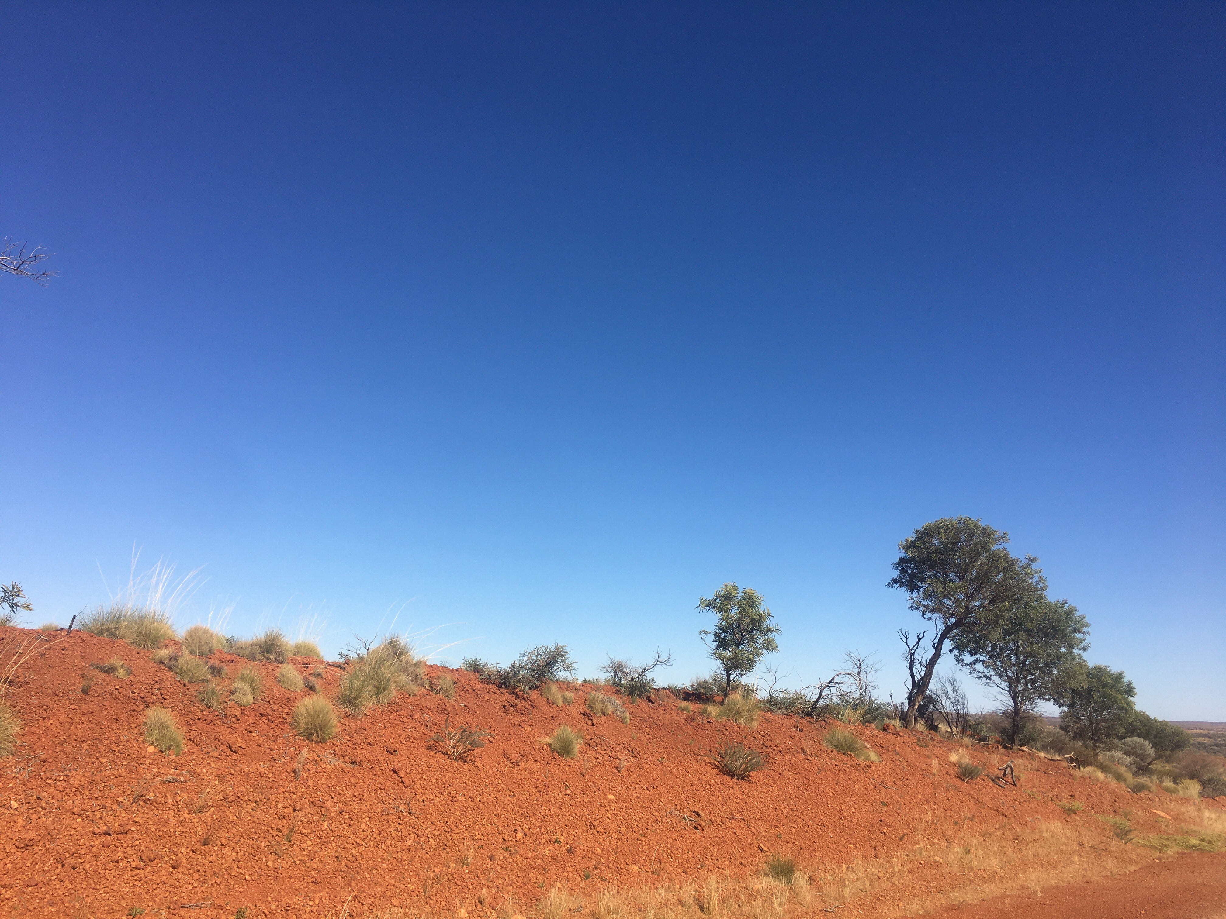 The ride today was one of my favourites so far. It was much warmer and we had a slight tail wind which was so appreciated to get through the planned kms with the later start. The countryside was very different from what we have seen on the Great Central Road. It was an expanse of desert country, undulating, with long sections of straight red road reaching into the horizon. The blue skies made a stark contrast against the red desert dunes dotted with spinifex and native bush land.
