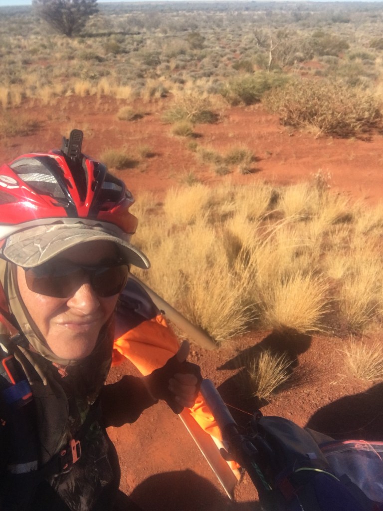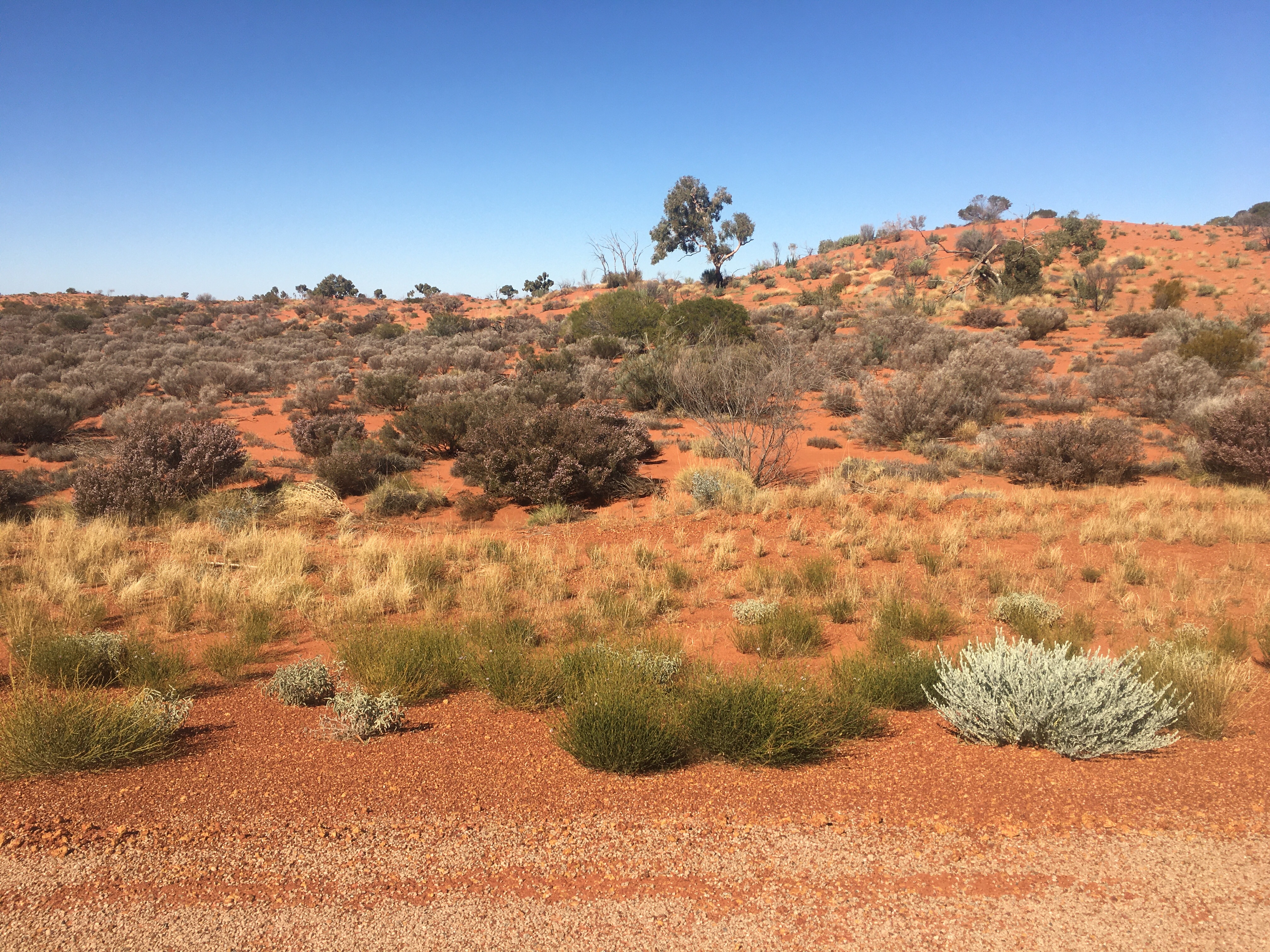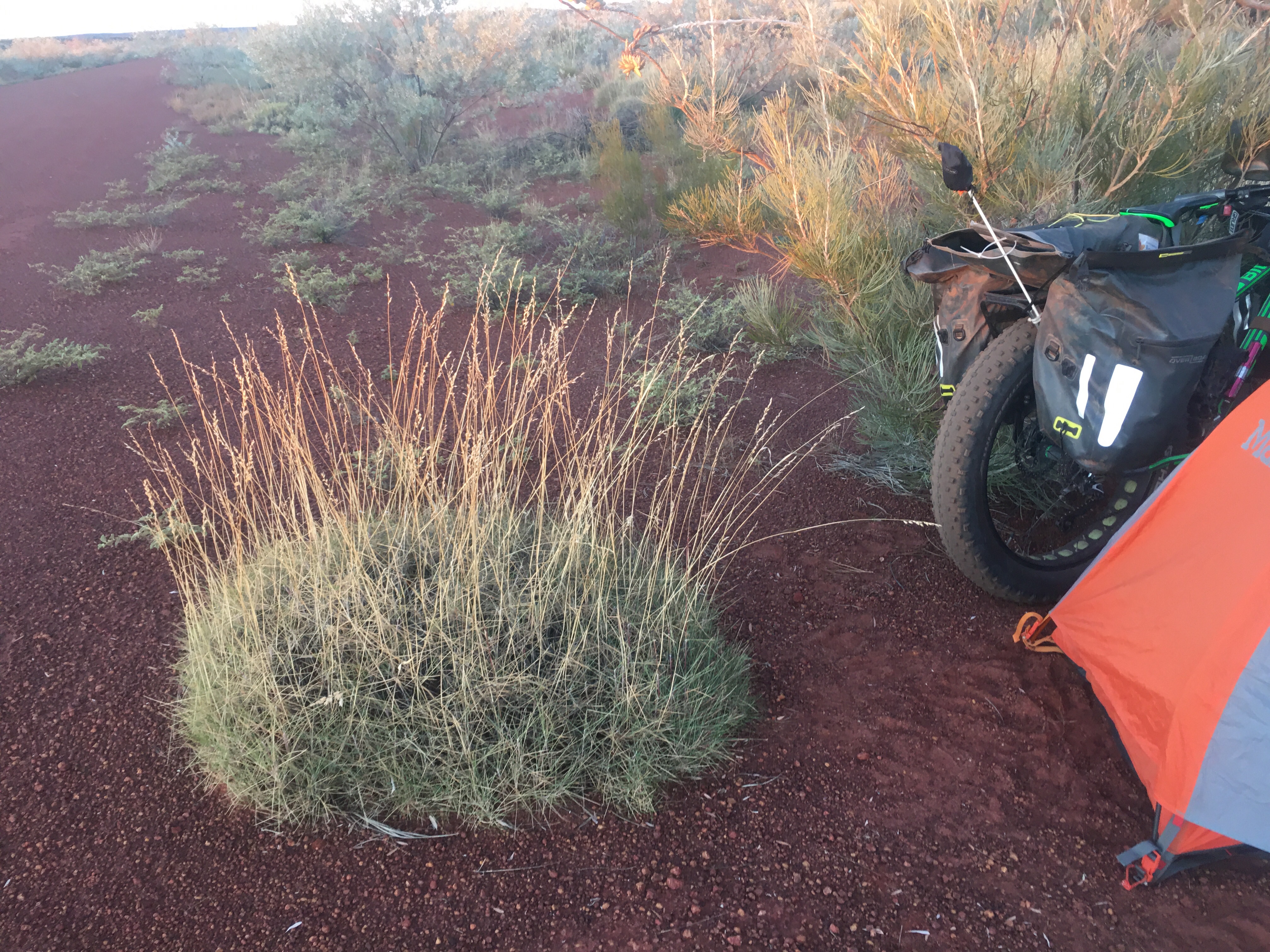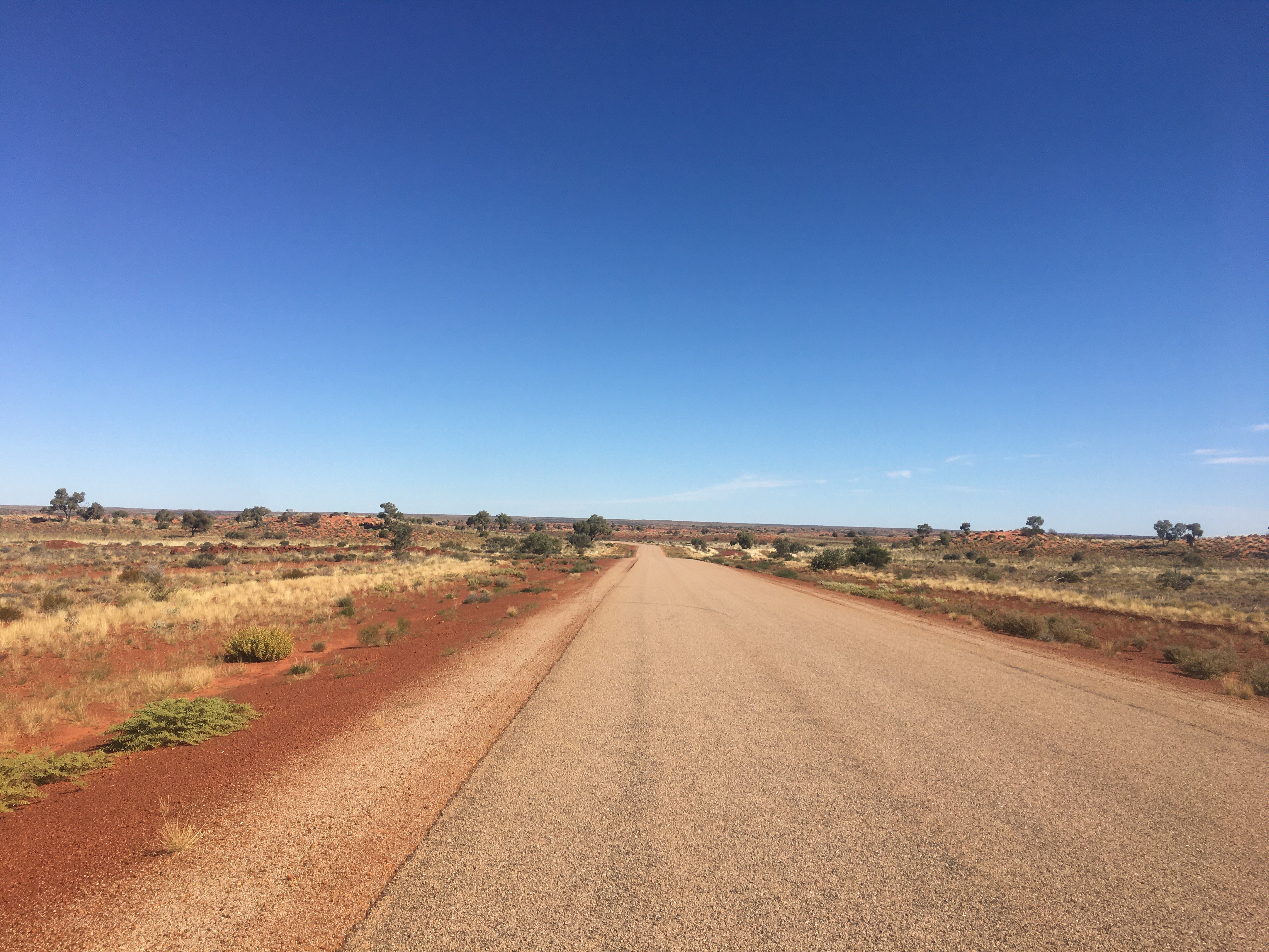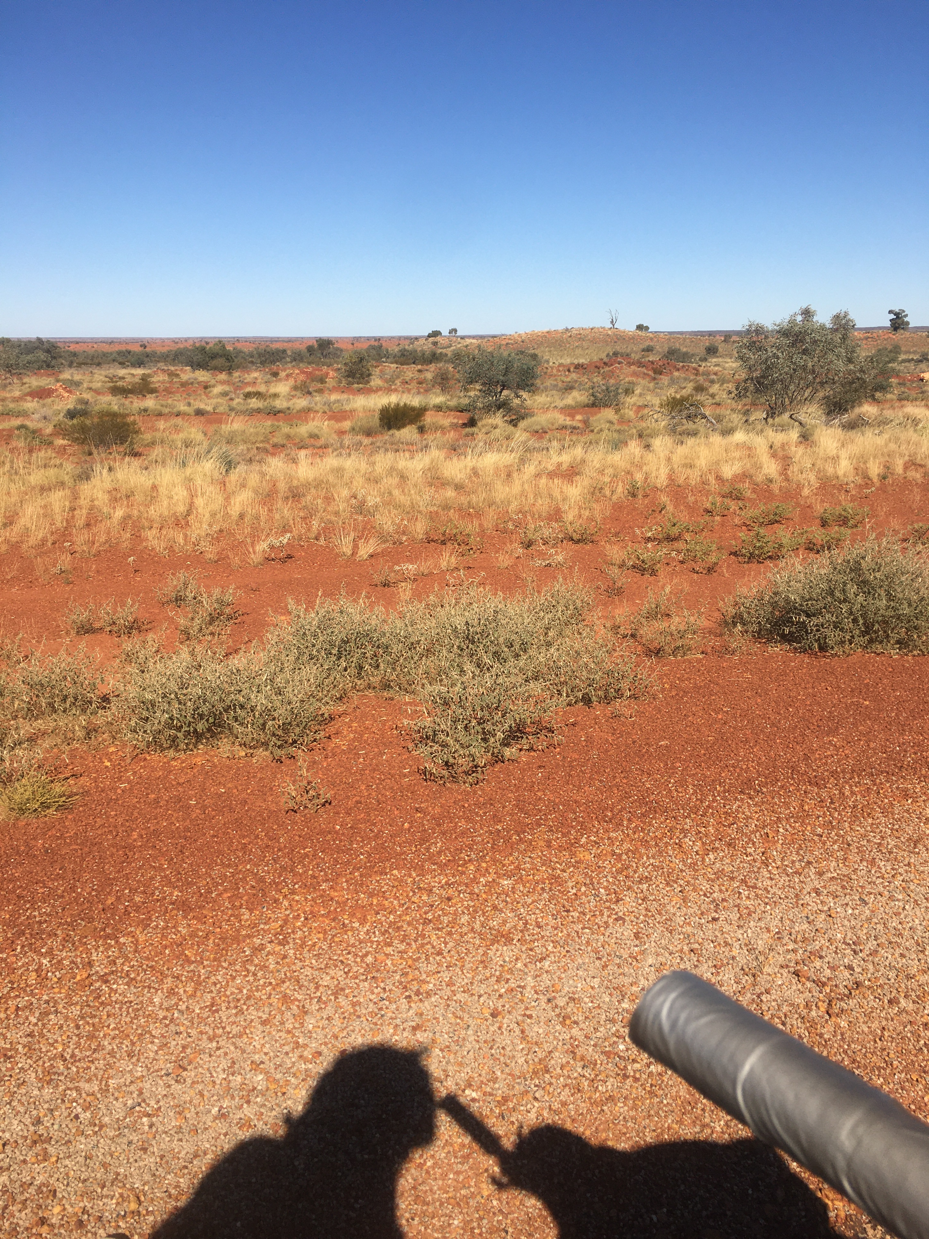 The ride today was one of my favourites so far. It was much warmer and we had a slight tail wind which was so appreciated to get through the planned kms with the later start. The countryside was very different from what we have seen on the Great Central Road. It was an expanse of desert country, undulating, with long sections of straight red road reaching into the horizon. The blue skies made a stark contrast against the red desert dunes dotted with spinifex and native bush land.