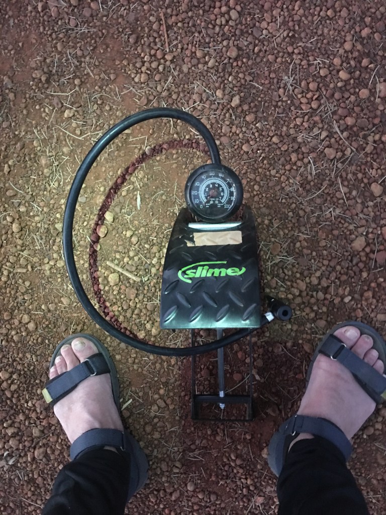 I asked them if I could used their compressor to seat Banjos tyres. Unfortunately their compressor wasn’t working so I used their foot pump instead. It worked a treat. It’s a ‘slime’ brand foot pump from Repco that retails for about $30.