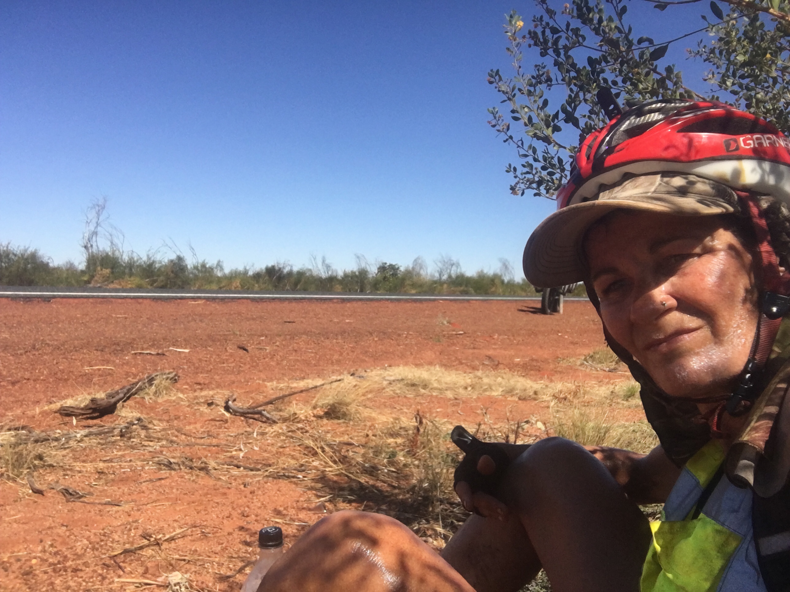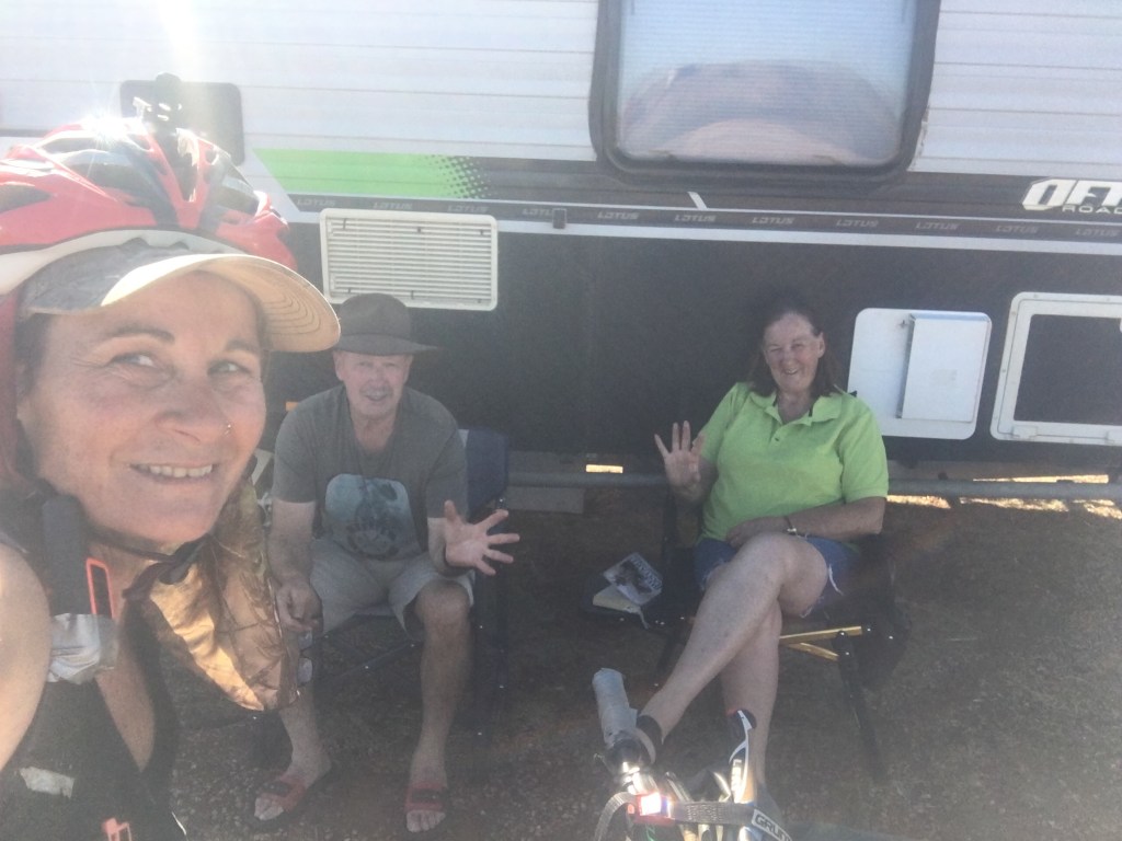 With 40kms to go I spotted a caravan stopped in a truck bay and had a break to say hi. The busy road means there’s little opportunity to meet folk and enjoy chats to break up the day. I jumped at the chance at joined them in the shade of their caravan. Jill and Trevor were good company. Trevor was cheeky and Jill was more reserved. Together they were interesting to talk with. We spoke about mental health challenges especially for men. They were very encouraging about our challenge and commitment to beyondblue.