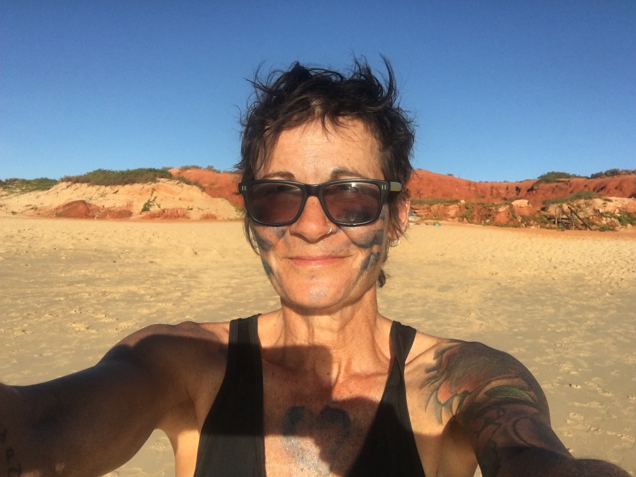Our next stop was at roadworks. We met Linton. His first comment was… ‘Nice war paint.’ He asked if we wanted a cold drink. ‘Oh yes please!!’ I parked Banjo against his car and filled my water bottle up with icy water, how delish. He was keen for a chat and gave us some good tips about where to stay in Fitzroy Crossing and Halls Creek. He suggested we’re better off staying in a motel in these towns as they’re a bit rough and Banjo will likely get pinched. Cars and bikes are targeted by locals in particular. Great heads up mate thank you!!! He also mentioned a great swimming hole at a spring 88k east of Fitzroy Crossing. It’s one to look out for!!! He gave us a Buff bandanna to keep the dust out of the nostrils along the Tanami. Linton said our story sound like a book that even would read 🤣 That’s the plan!! He was so keen to help out and we had a big hug before I headed off. You’re a gentleman Linton xx