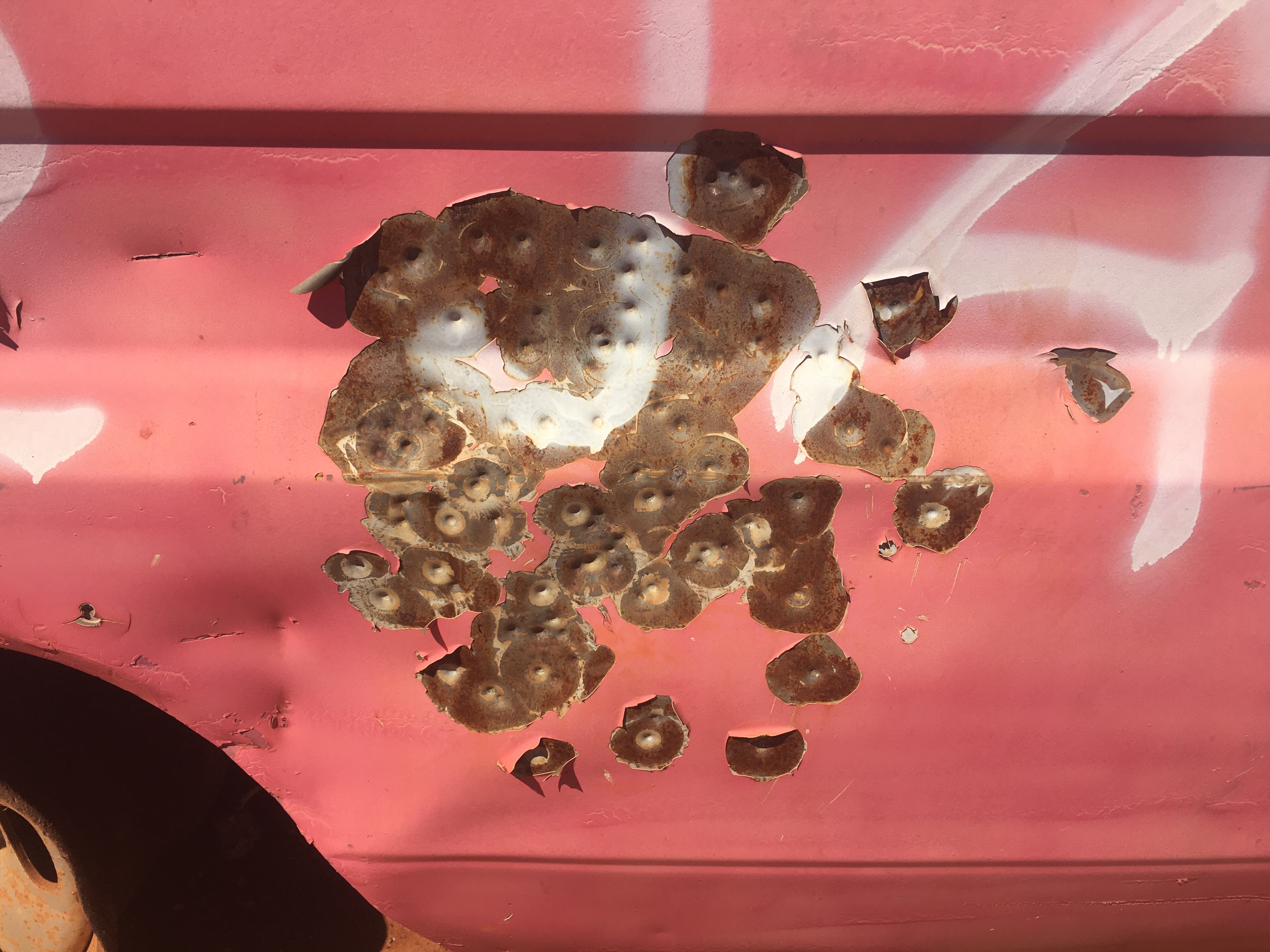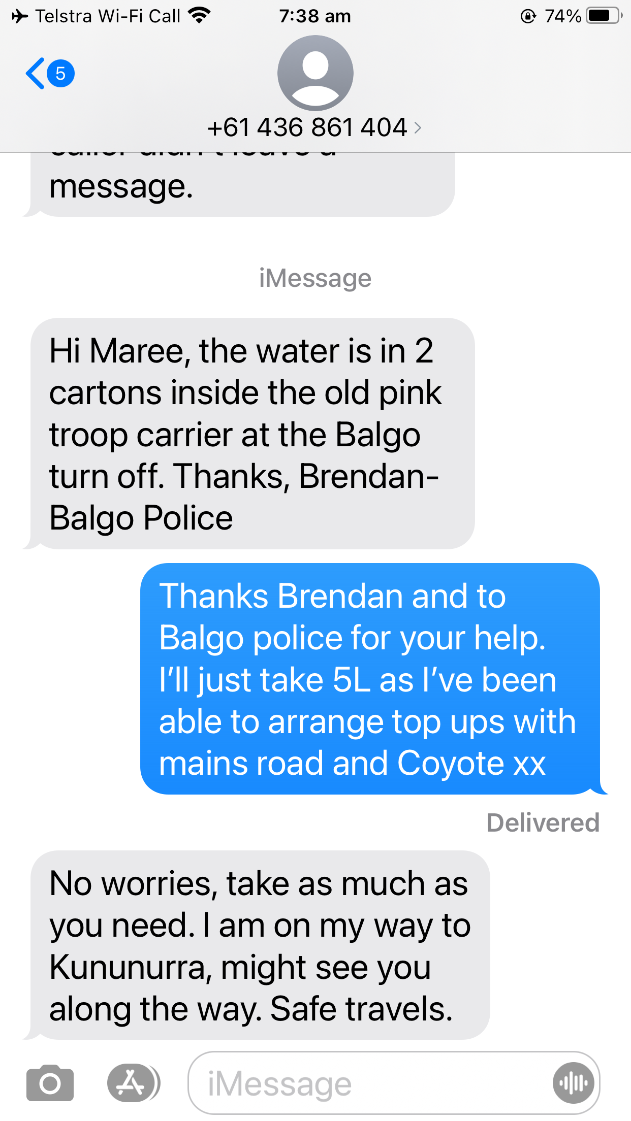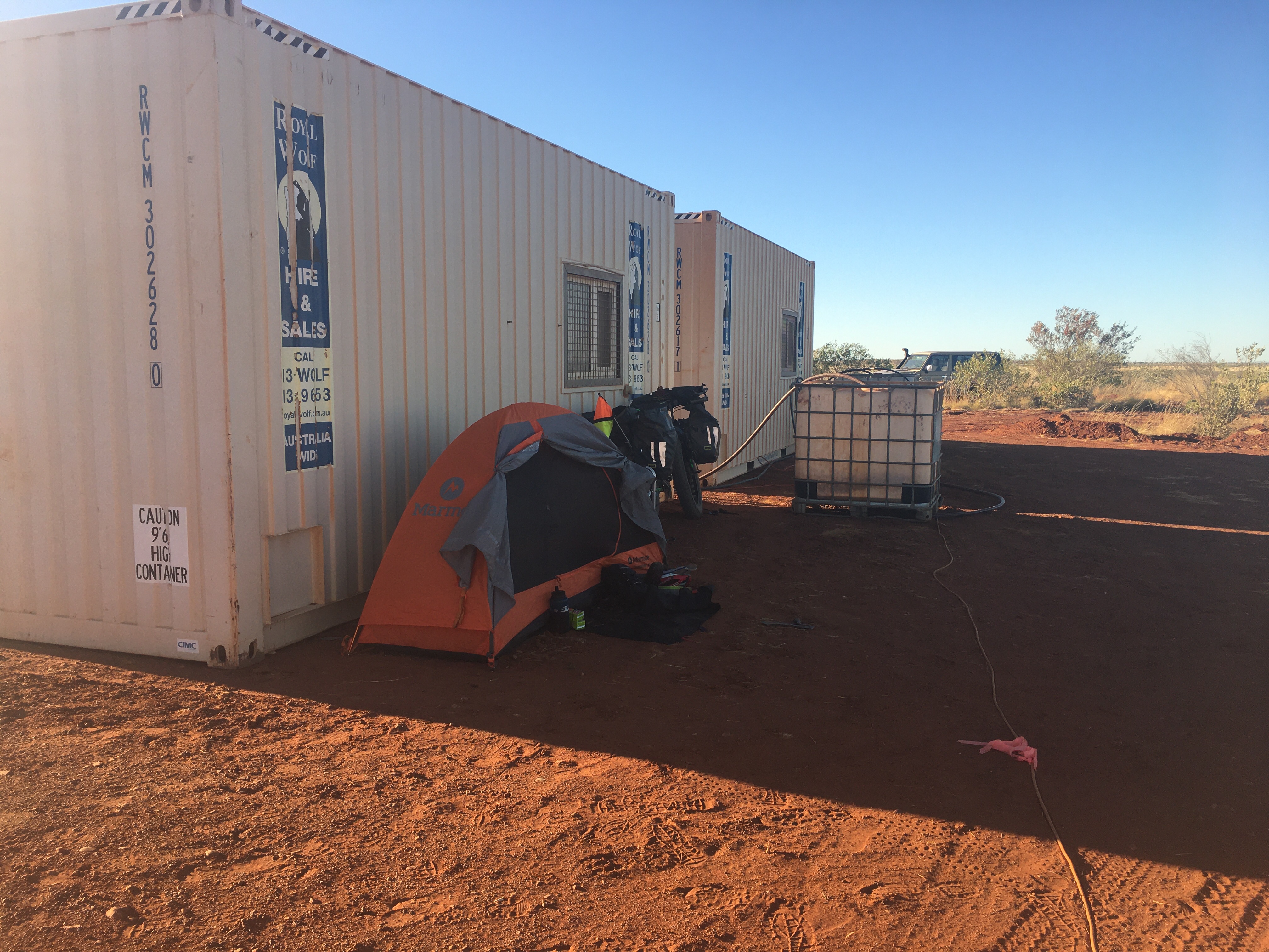 Bianca offered to take extra water so I could water up overnight at their last marker 25km past Balgo. Matt was heading out to survey next week’s work and carried the water left by Balgo police to the border. I got a text from Brendan to say they had left it inside the pink car body at the junction.