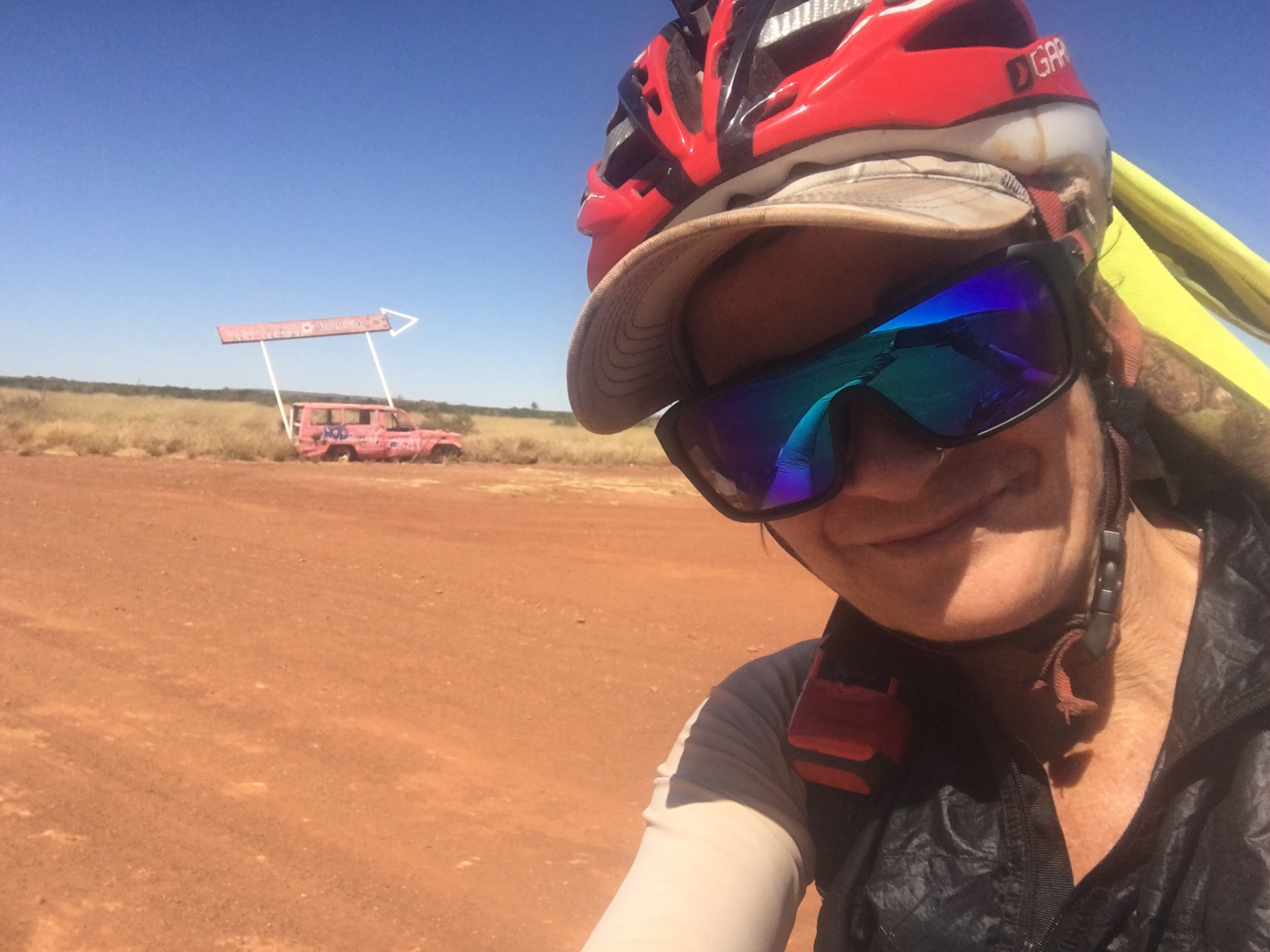 The next milestone was arriving at the Balgo junction another 8km on. There was a surveying crew there and we videod each other as Banjo and I pulled up. Very funny!!!! They offered to take a photo of us next to the pink station wagon.