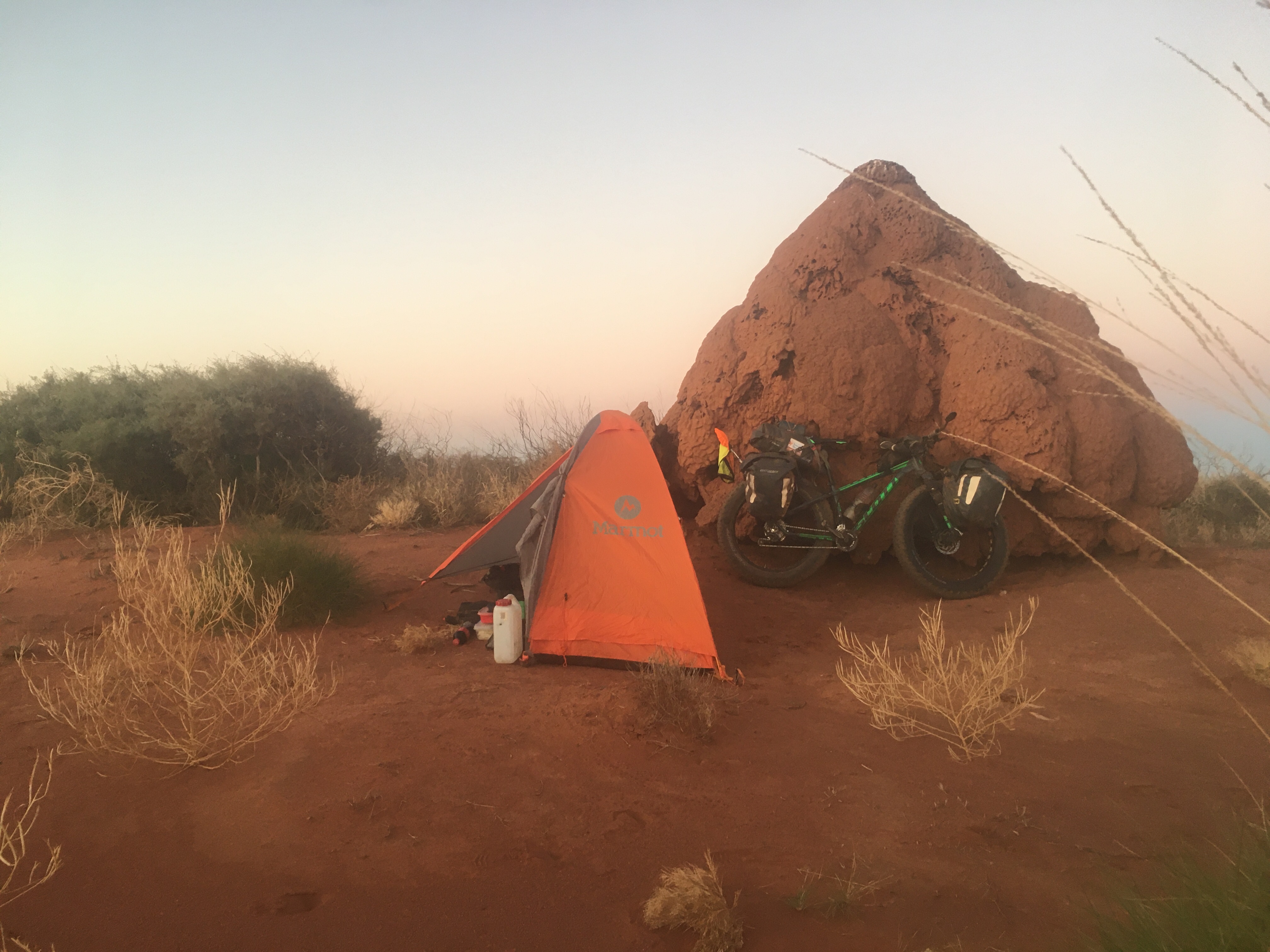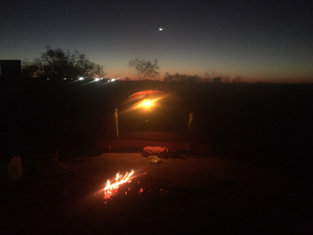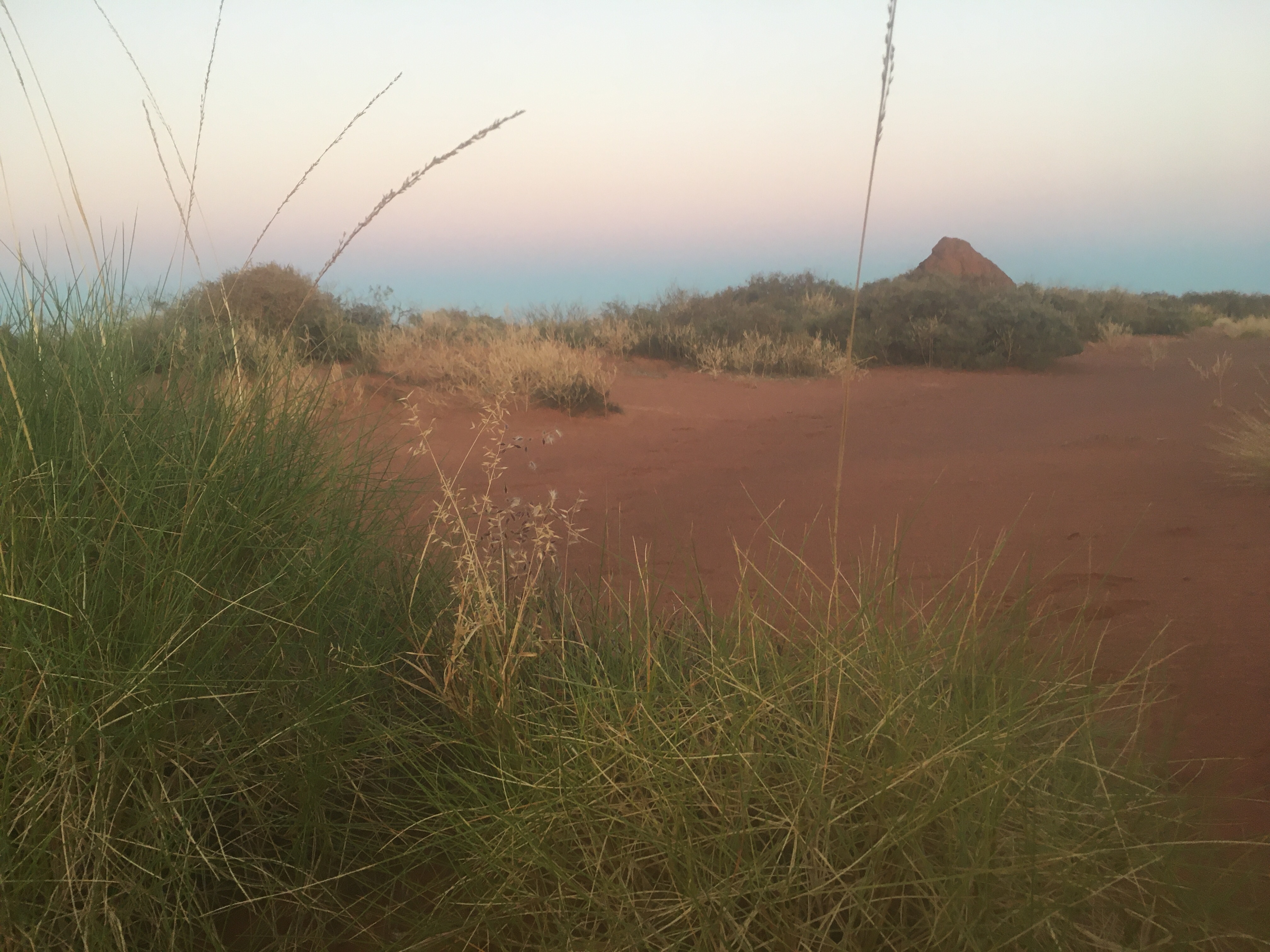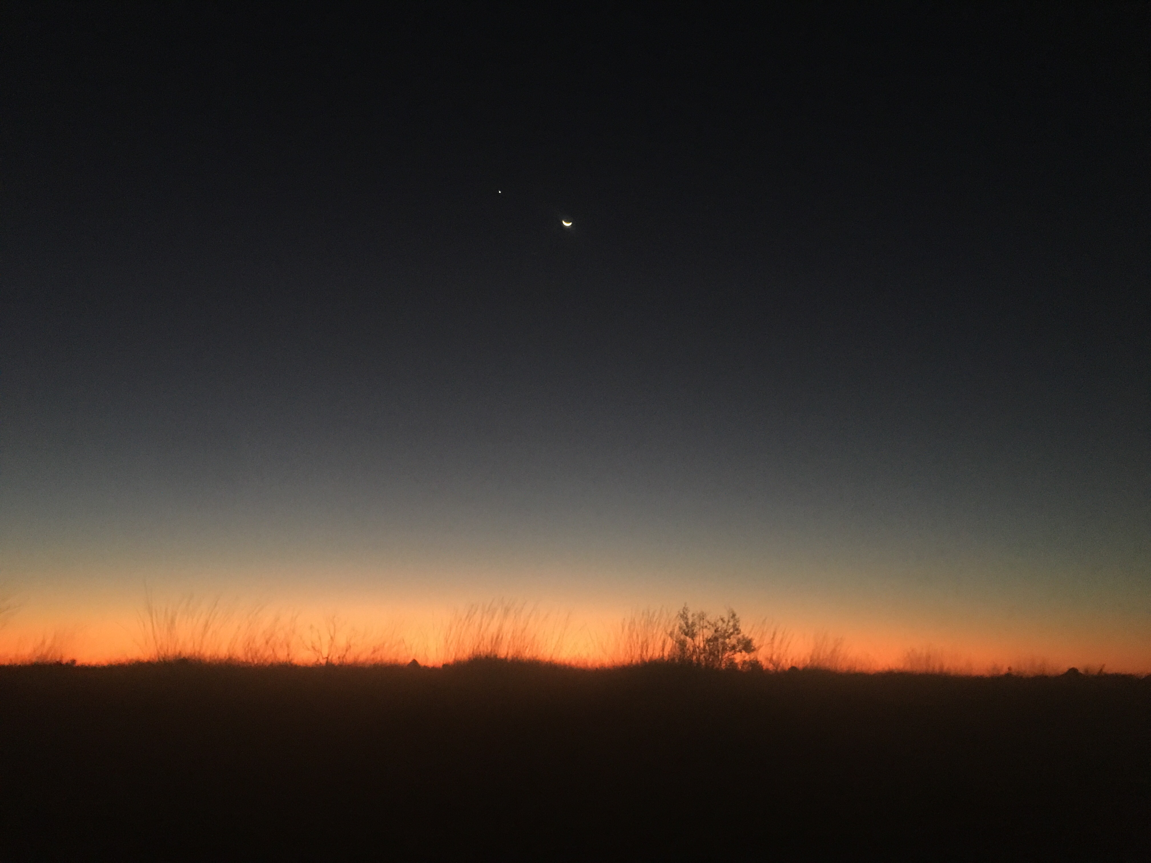 We’re tucked behind an anthill of low lying all burr bushes and spinifex. We rode through similar countryside yesterday and it’s special now to be nestled amongst the scenery under the crescent moon, evening star and a sky full of diamonds.