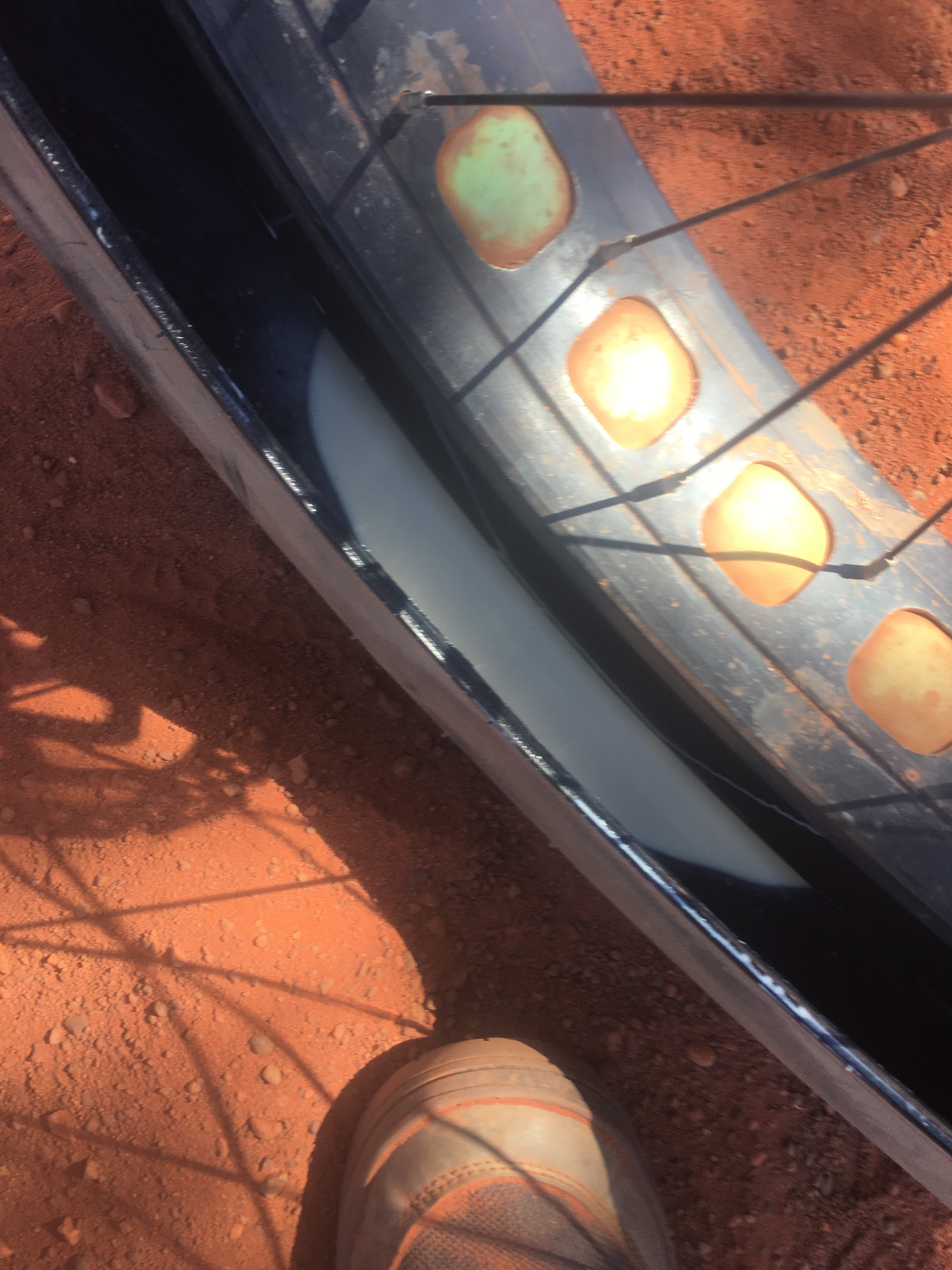 Just a few kms down the track, Banjo got a cut in his tyre. Sealant everywhere. Bugga!!! Fortunately it was near a shady tree and I got busy patching the gash and refilling his tube. I enjoyed my fruit while I waited for the patch to dry and flagged down a car to ask for some water to top up my bottles. It was thirsty work!!!