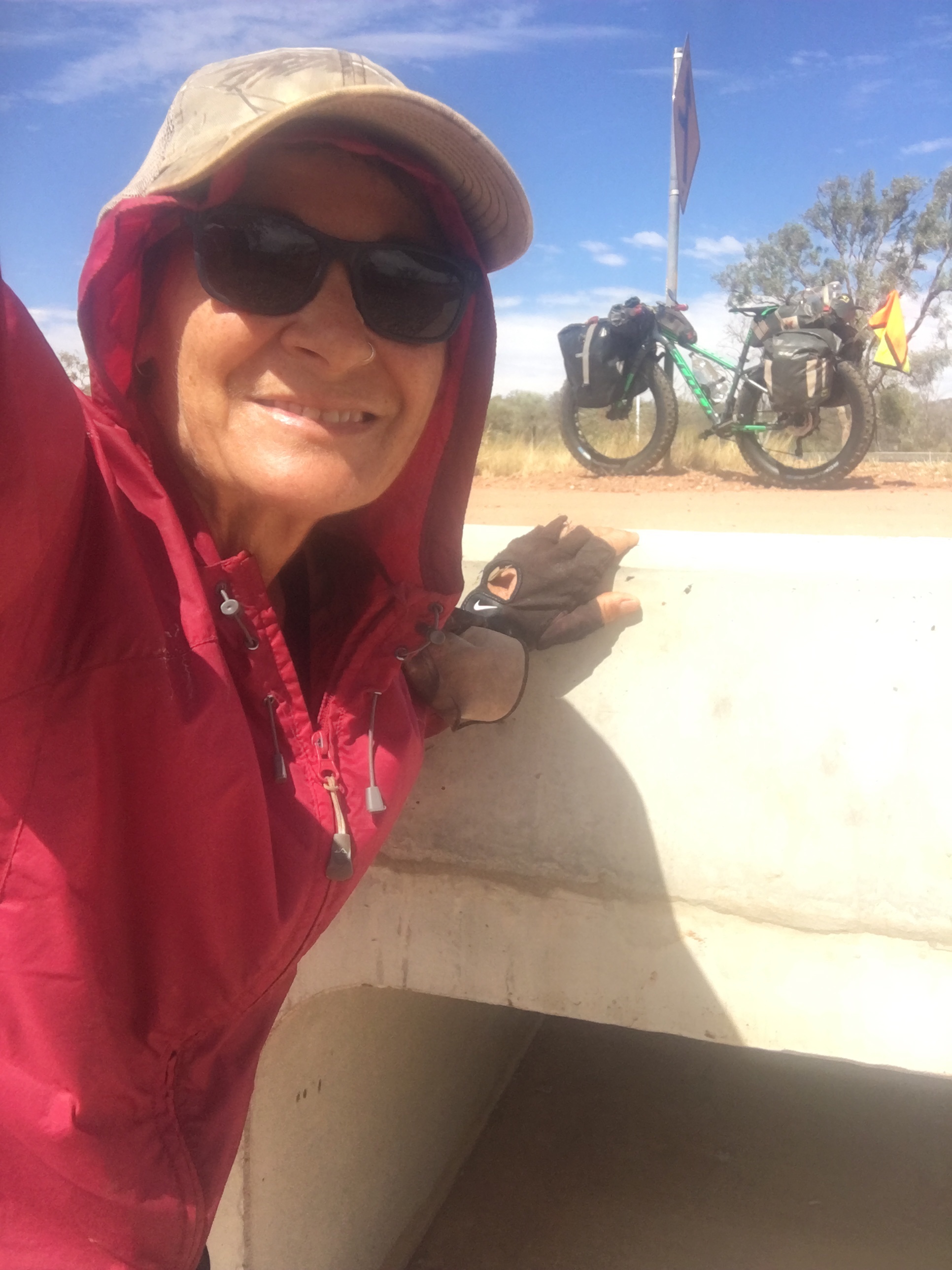 We then got into our day. It was cold today. The wind had an icy chill we haven’t had for ages. It was slow going for the most part of the day with a 30km headwind and 40km gusts. I cycled with my jacket and leg-ins all day. The legs were feeling a bit weary after the 140kms yesterday. That’s the downside of having a bunch of days off in Alice. No regrets but. It’ll take a few days to get the legs spinning again. It’s tricky when it’s windy because it’s more of a slog than a spin and lactic acid builds up quick. At 25kms we found a concrete drain which I could tuck myself in behind and have a break from the wind. It was nice to warm up in the sun while I called the folks and a bonus to have reception.