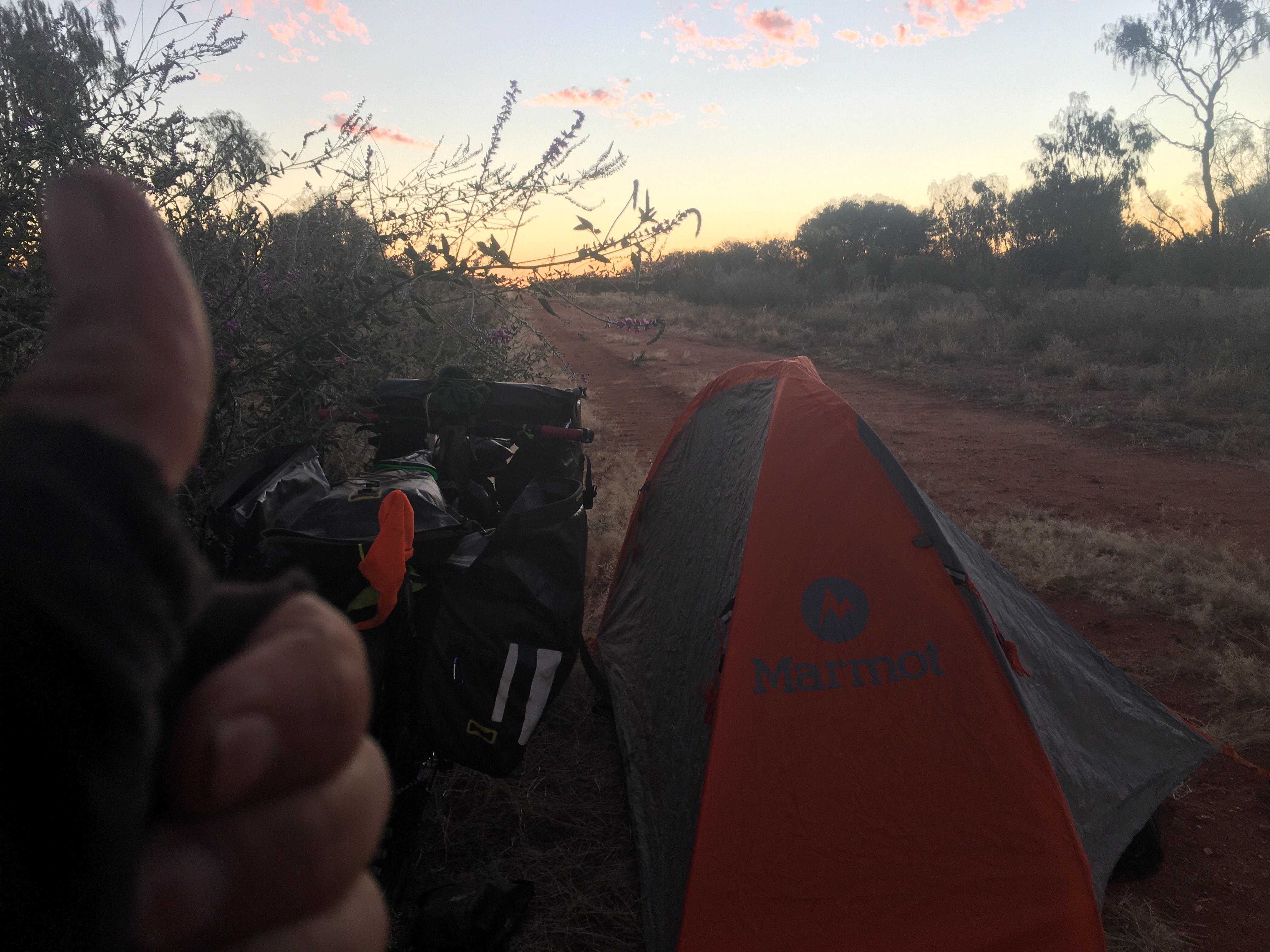 It’s so nice to be back camping under the stars for our first of two ninja camps to Jervois Station. There’s a campground there so we’ll be able to water up and charge the batteries for the next stint to Tobermorey before the Qld border. I noticed a dirt track running parallel to the road when we were looking for a camp. It was following the cattle fence line and we held of until there was shrubbery to camp behind. Then I saw this spot which was perfect. The trick was getting banjo through the grasses to the track. Unfortunately there must have been dried burr bushes amongst the grass and we picked up a zillion dreaded burrs in both tyres. Bugga!!! The sealant has worked a treat on his front tyre but unfortunately not yet on the back. I pumped it up and road around a bit hoping that would do the job but no luck yet. So that will be our first job in the morning. Hopefully we can get the sealant to do its thing without having to change his tube. Let’s see what the morning brings.