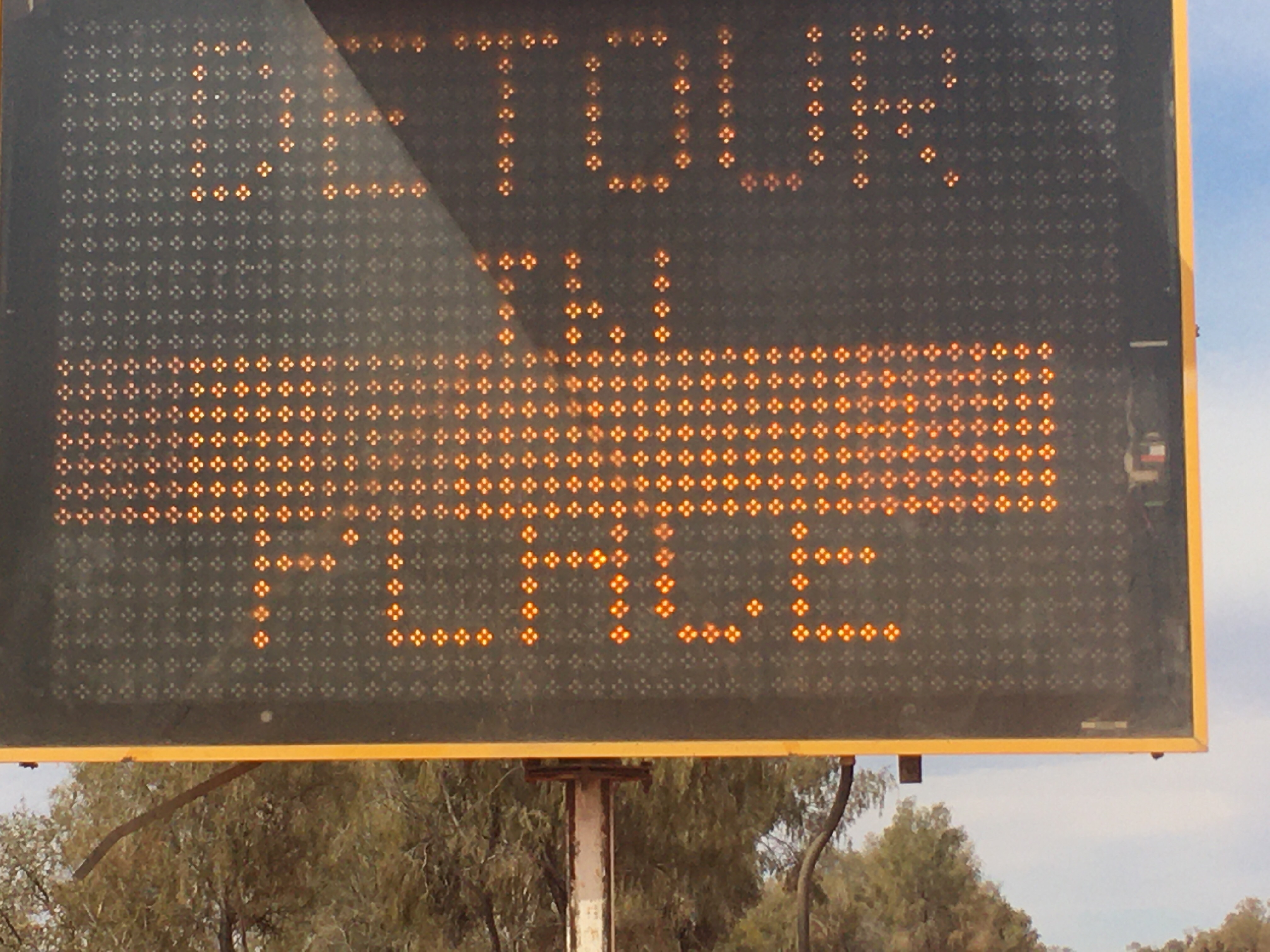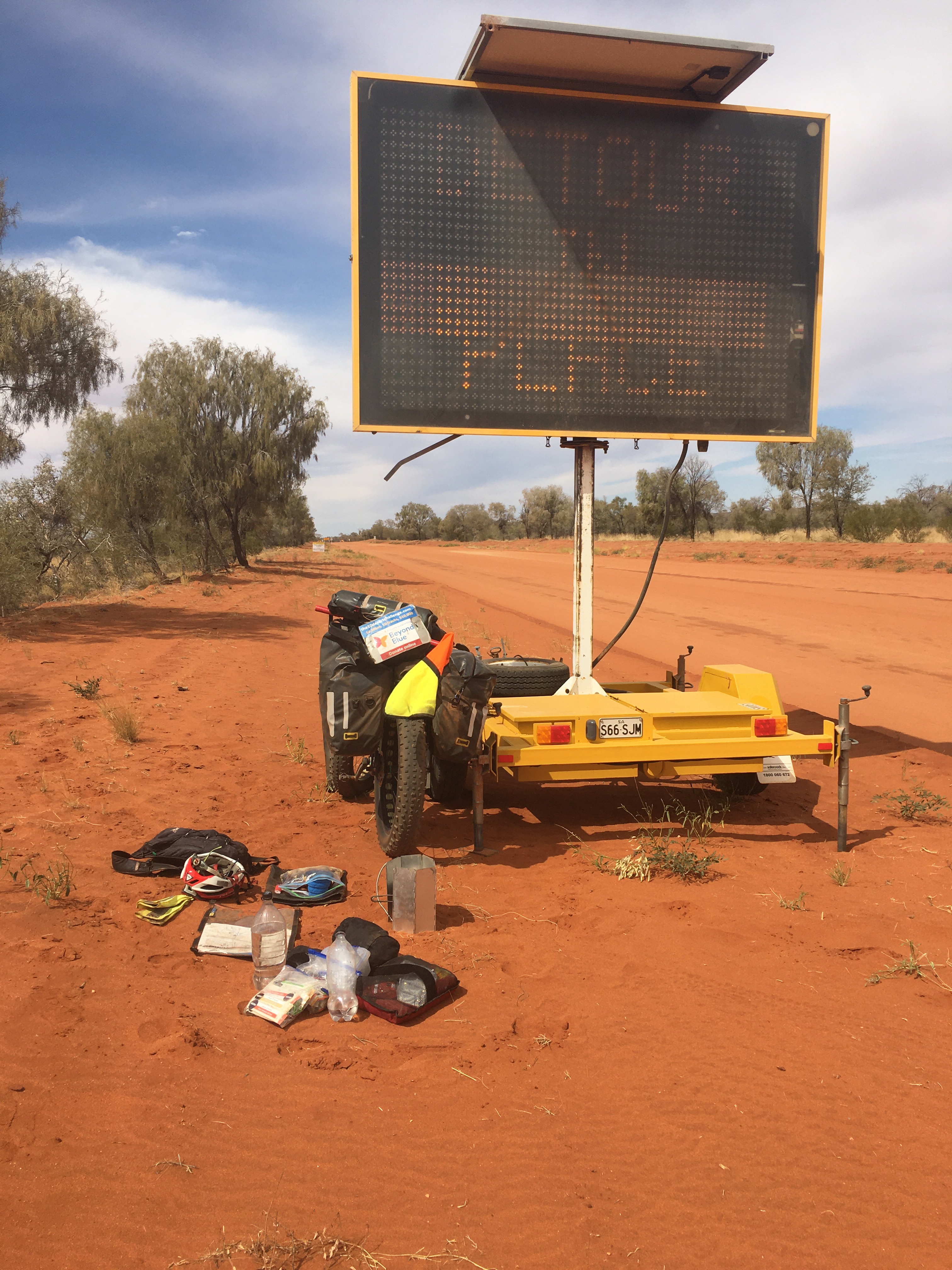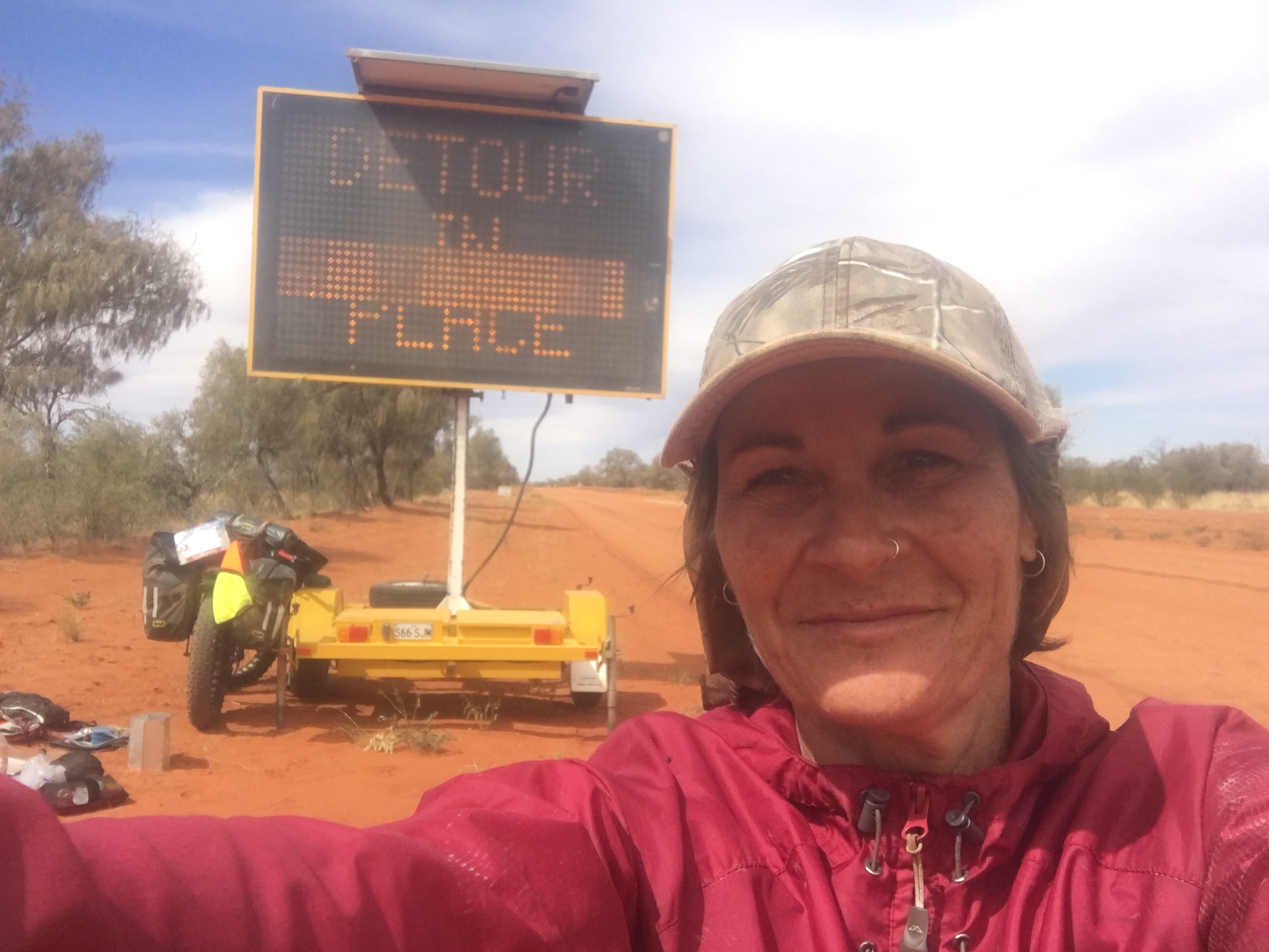 By lunchtime we had managed just over 40kms which I was happy about in the conditions!!! It was time for a cuppa and a snack. I found a spot behind a road works sign out of the wind. Ironically the sign was flashing, ‘Detour in Place.’ It made me think about our rerouted stage now along the Plenty. We’re certainly on a detour to the Simpson. The impact of Covid has reared several times during our challenge. Fortunately we haven’t had to change our plans too much and can still honour our goal of crossing or traversing the 10 deserts of Australia.