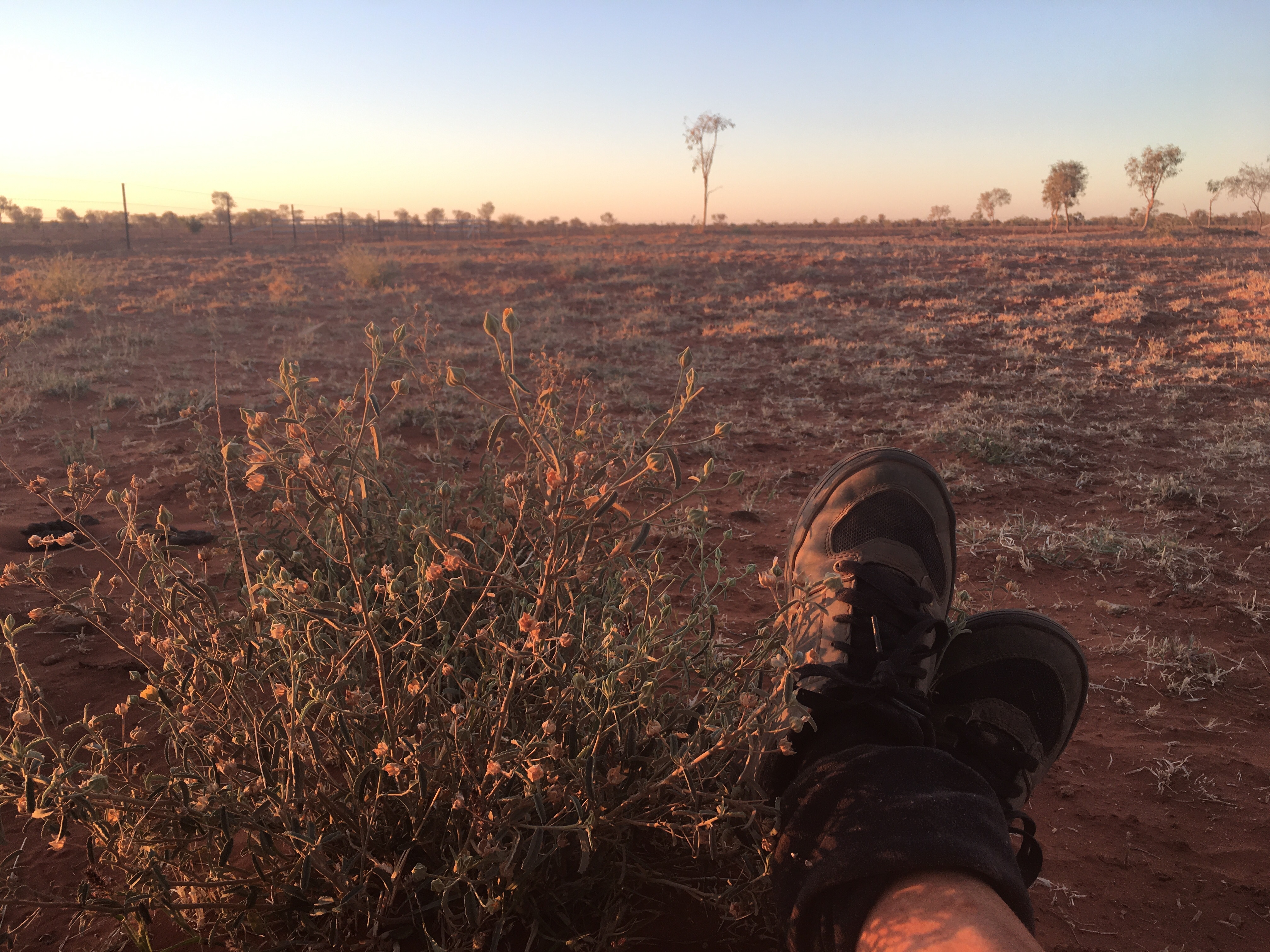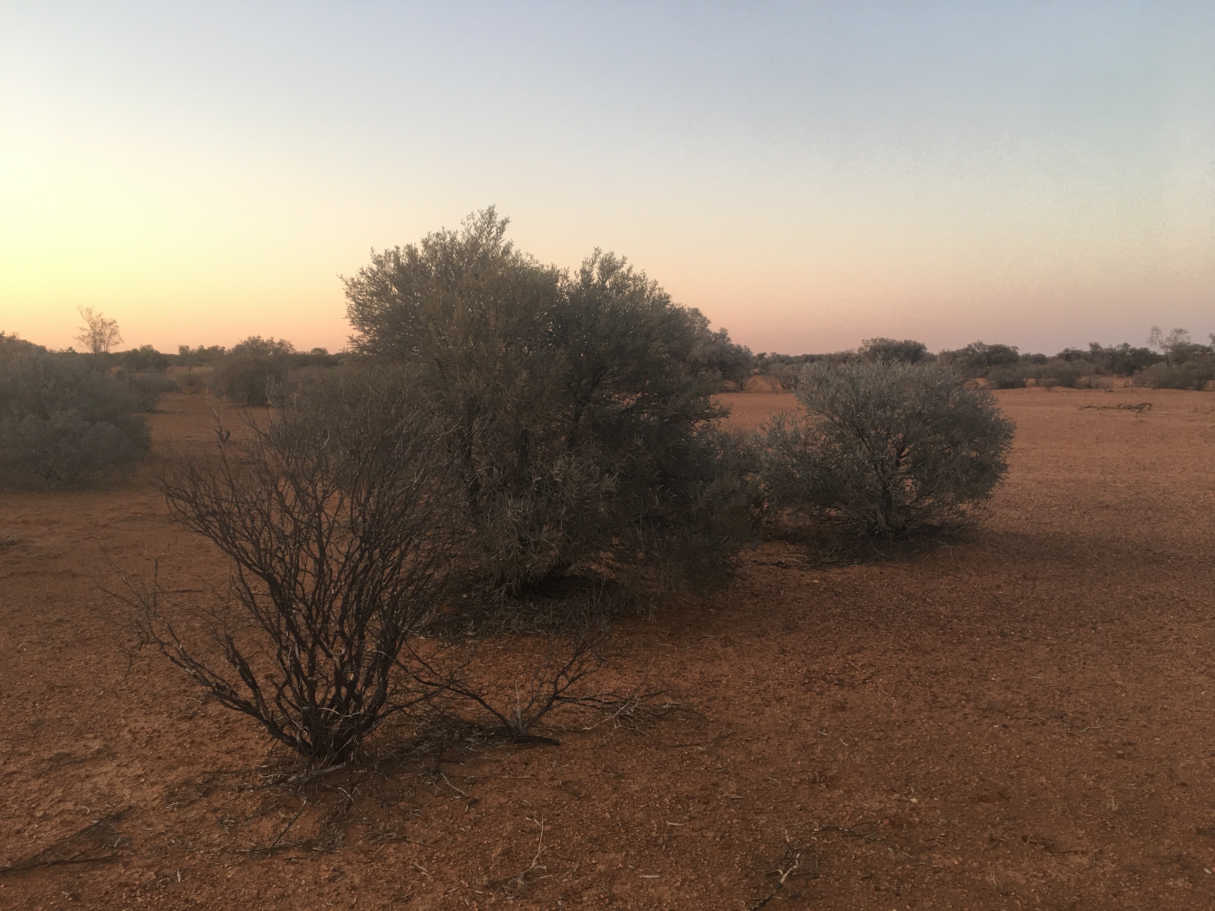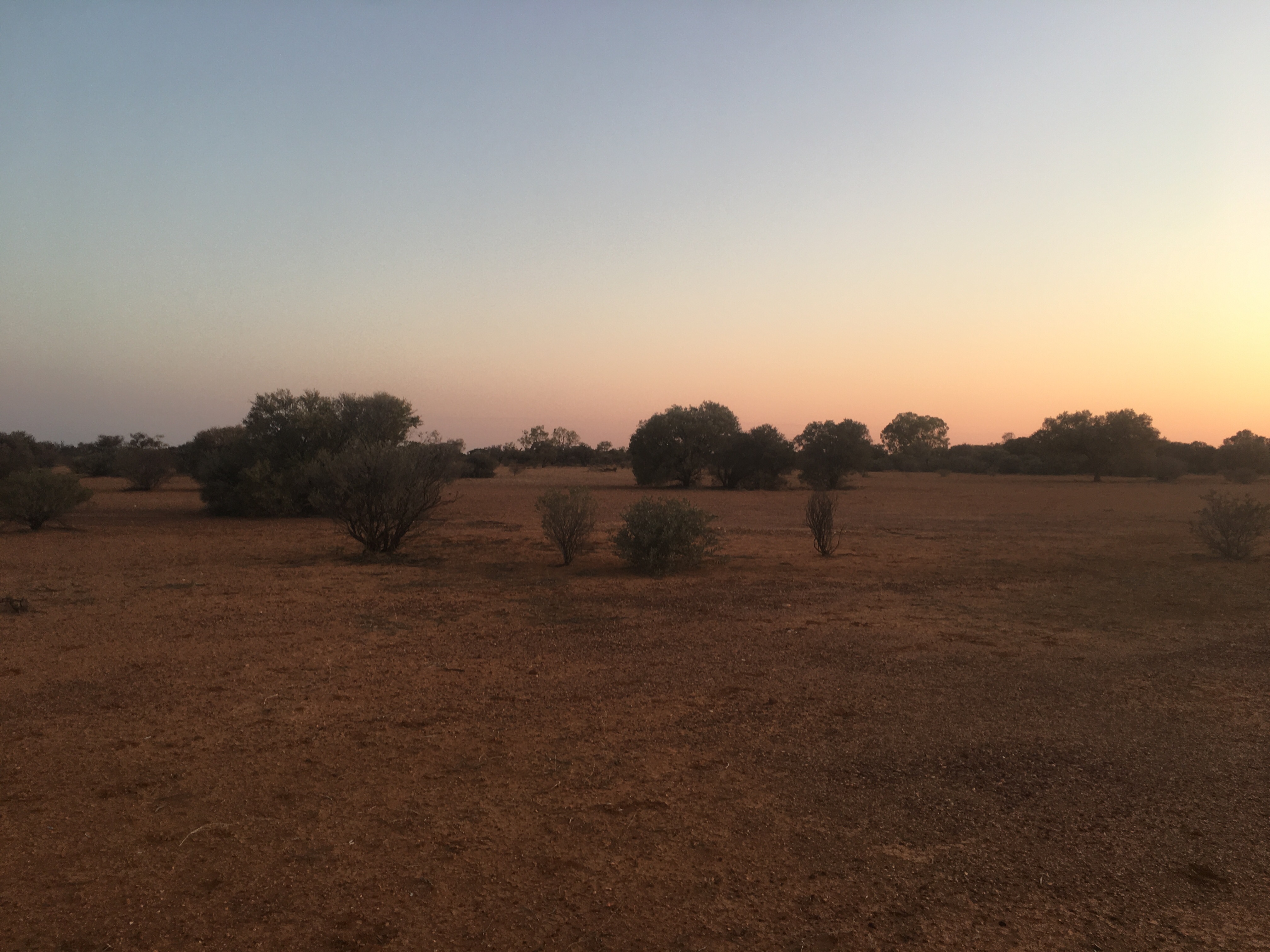 With just over 50kms Boulia, we found a camp behind shrubbery along a floodway. The ground is red dirt and clear of dreaded burrs. So Banjos happy and resting with his tyres intact. We were set up to enjoy the colours around camp over sunset o’clock.