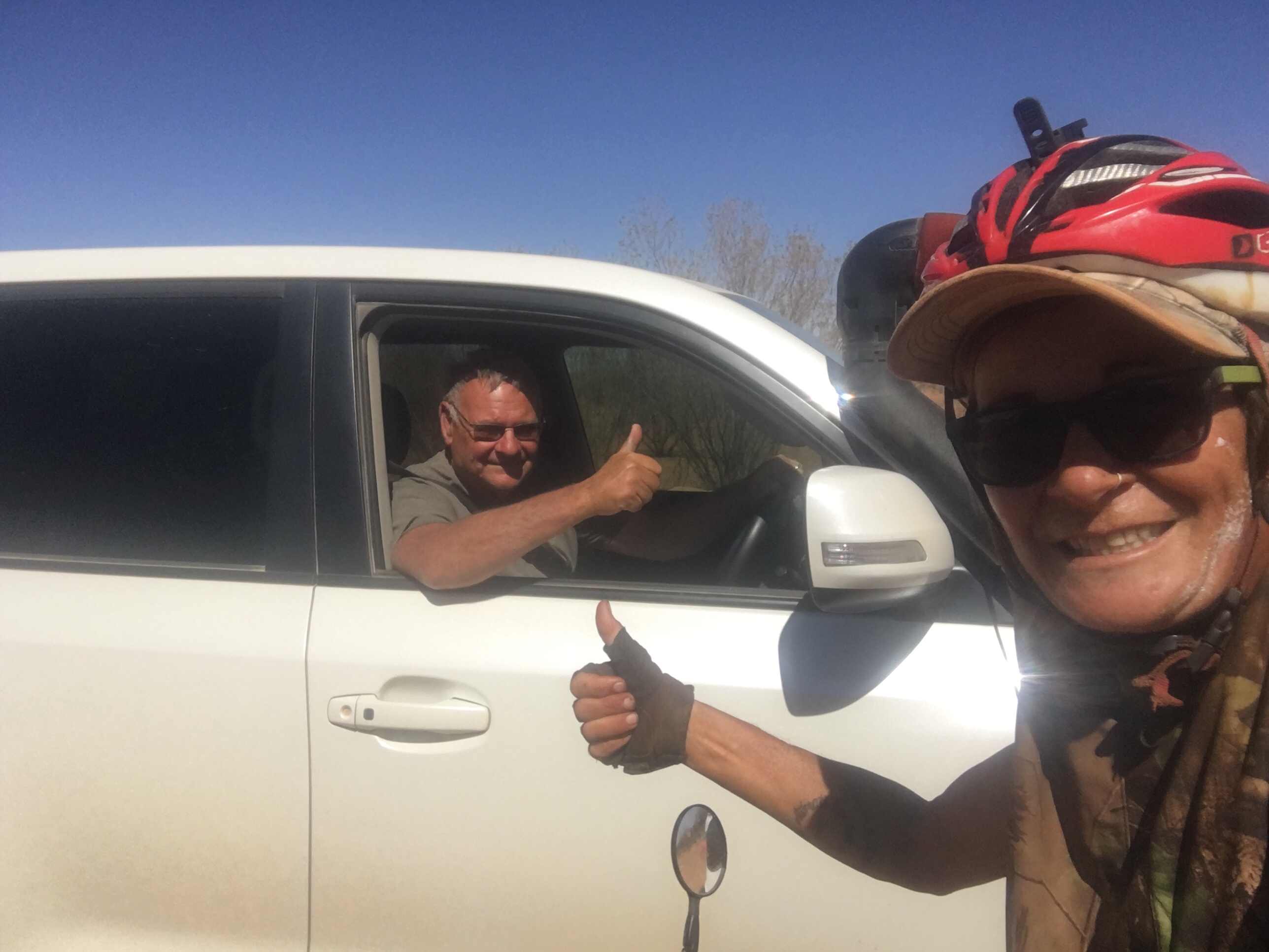Our first car stopped during the break to check we were okay. We met two friendly young guys on a road trip along the Plenty. One guy had been in and out of hospital with mental health issues. He spoke about the space in this countryside being so good for his head. I can also vouch for that one mate!!! He’s looking forward to getting back into mountain biking and was very impressed with Banjo. The boy was glowing red dust and all smiles with the compliments.