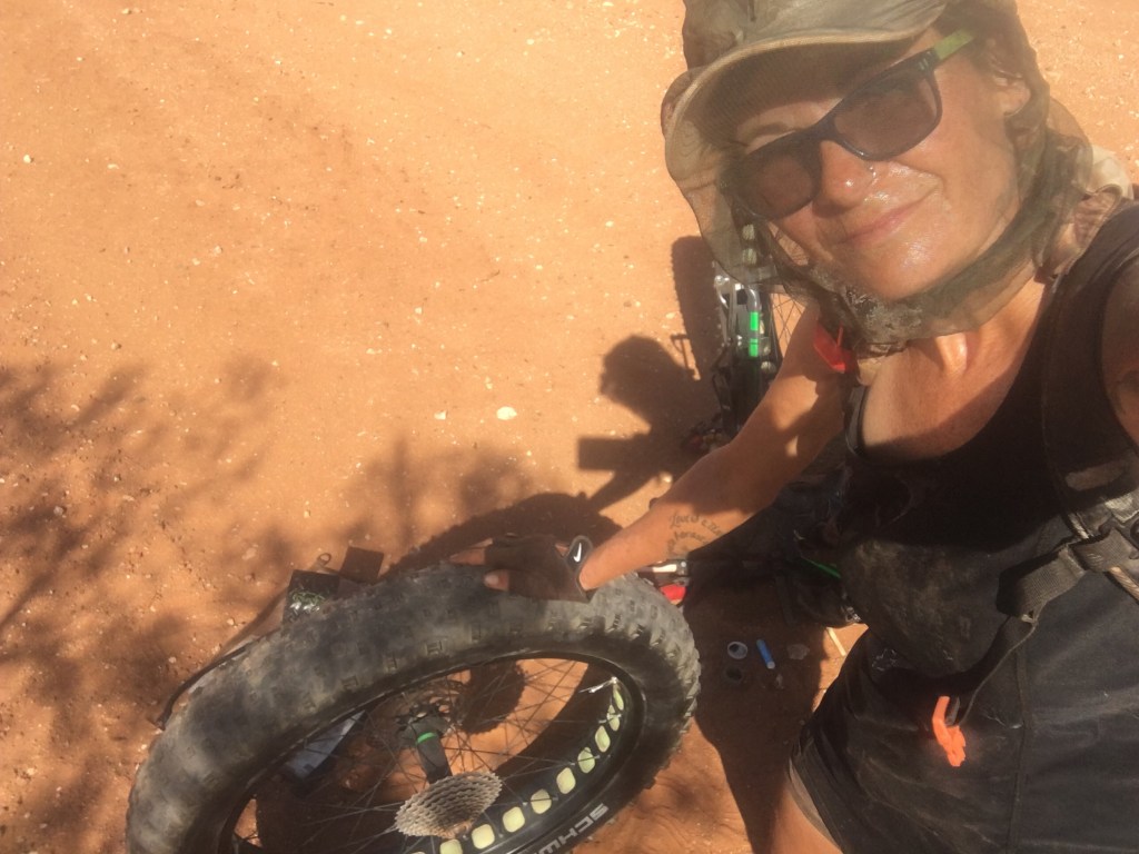 I disassembled him and checked out the tyre but couldn’t find any gashes. My first thought was that it just needed to be pumped up and let the sealant do it’s thing. Mmmmm wrong call!!! I spent the next hours stopping and pumping up his tyre again. Then the foot pump stopped working. Bugga!!! By this stage we were both over it and covered in red dust from the wind. Katie texted the right advice!!!!
