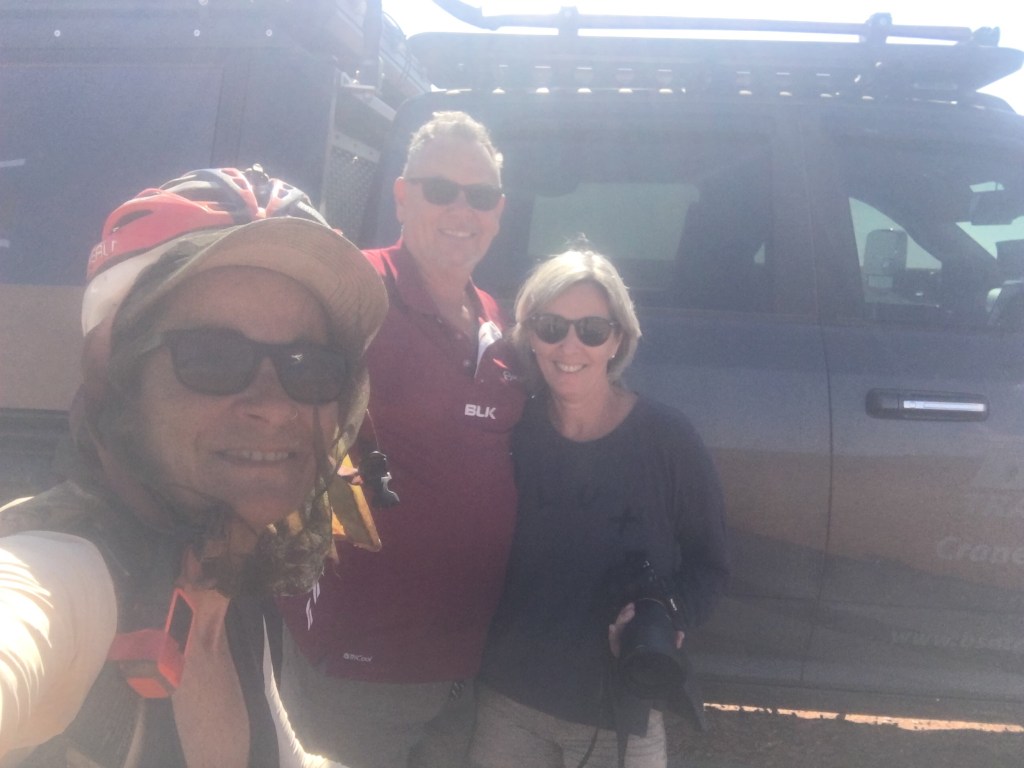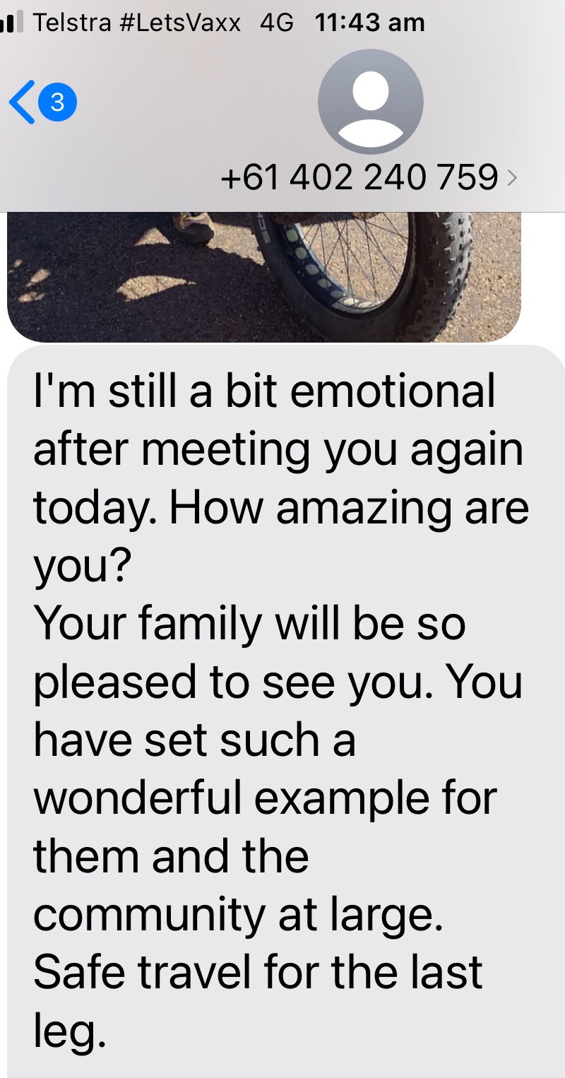 We had a second car stop which was wonderful. I met Anita and a friend travelling in convoy with a guy who had just retired from policing. They were so impressed about our challenge. “Woman can do anything” said Anita. I don’t know about that, but it was fun to talk with the folk who were all full of positivity. It’s so contagious. They’re excited about their road trip linking the plenty with the Tanami. They said the Tanami border into WA opened two days ago!! I find that surprising. Have a great trip fine folk!! Anita took a photo of our web page to share on her socials and donated $20 before getting underway again 🙏