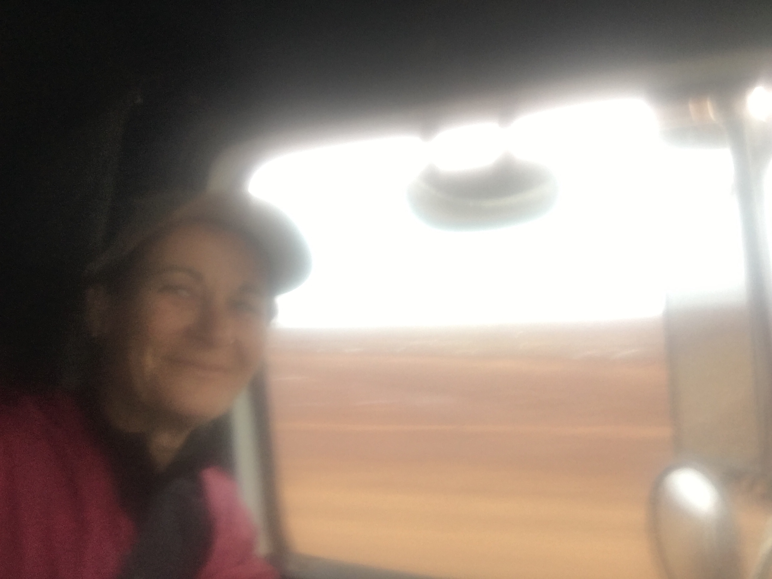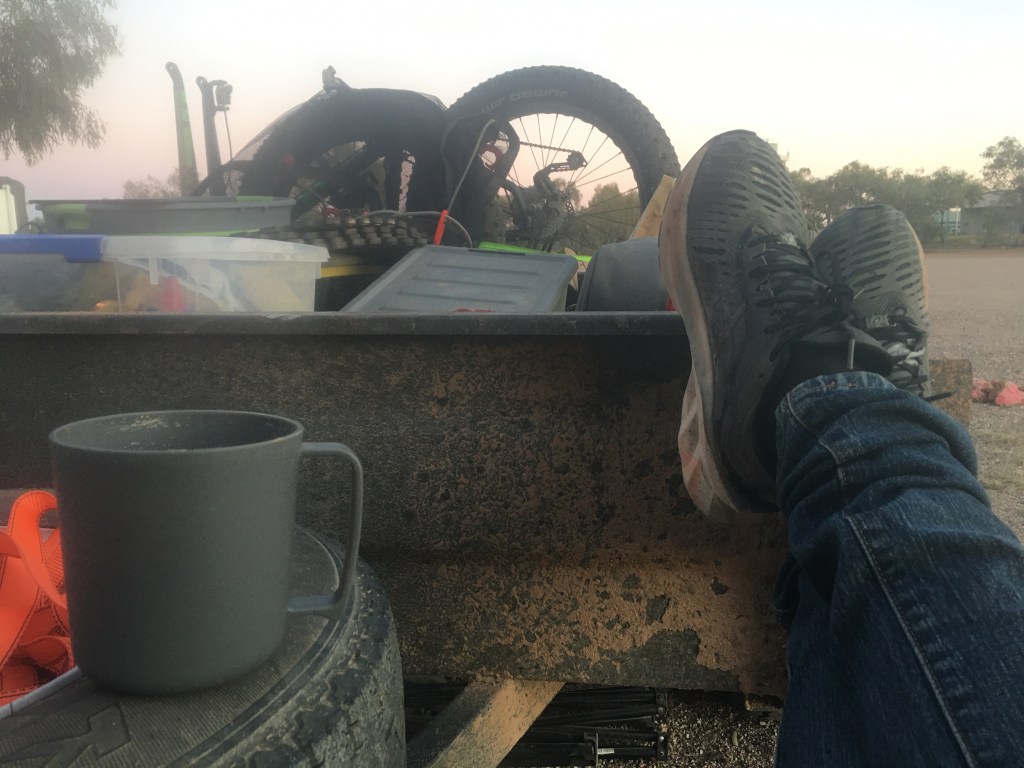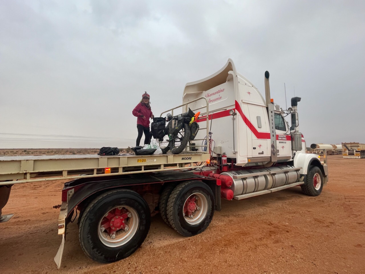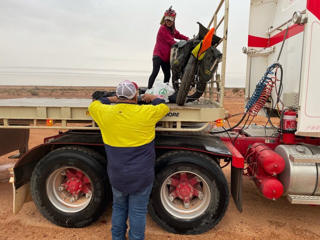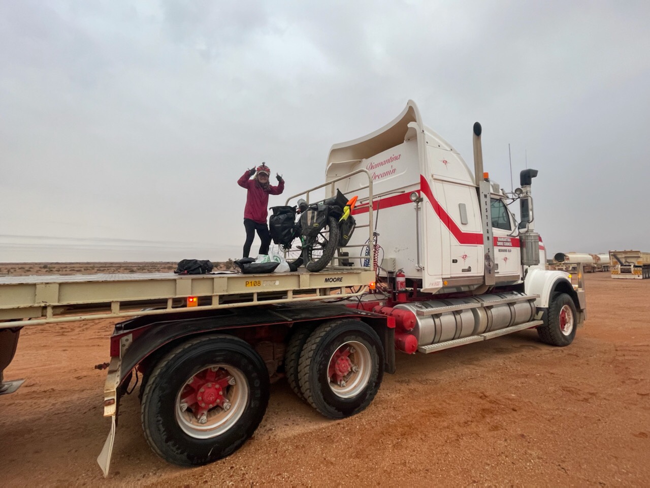 It was a wild night with dust blowing at gale force. Far out!! What a long night with little sleep. I kept checking bom from about 4am onwards. But deep down I knew we weren’t cycling any more kms into Birdsville. We met the crew at 6.00am muster. Nathan, a truckie at the camp, was doing a run into Birdsville and offered Banjo and I a ride.