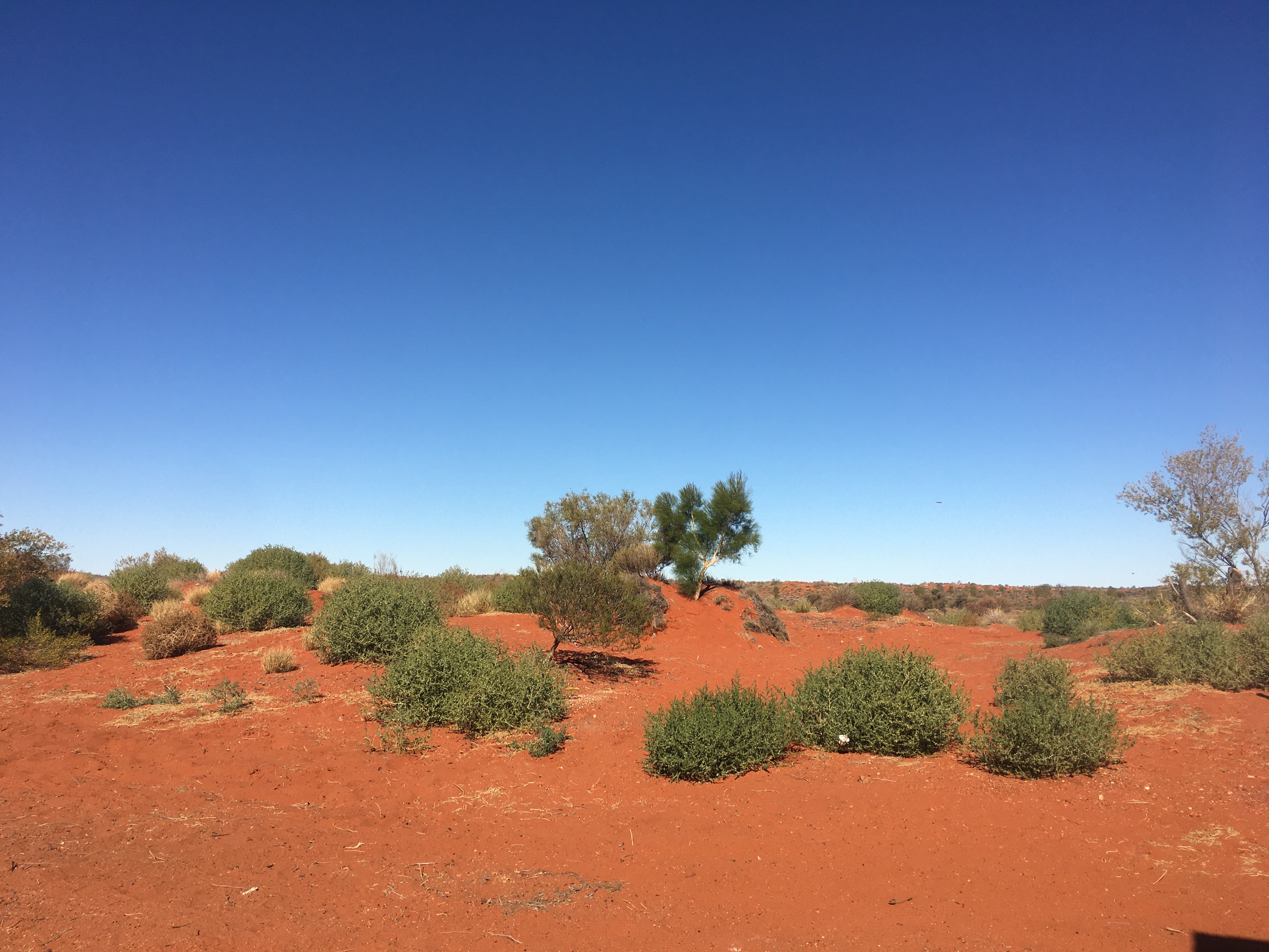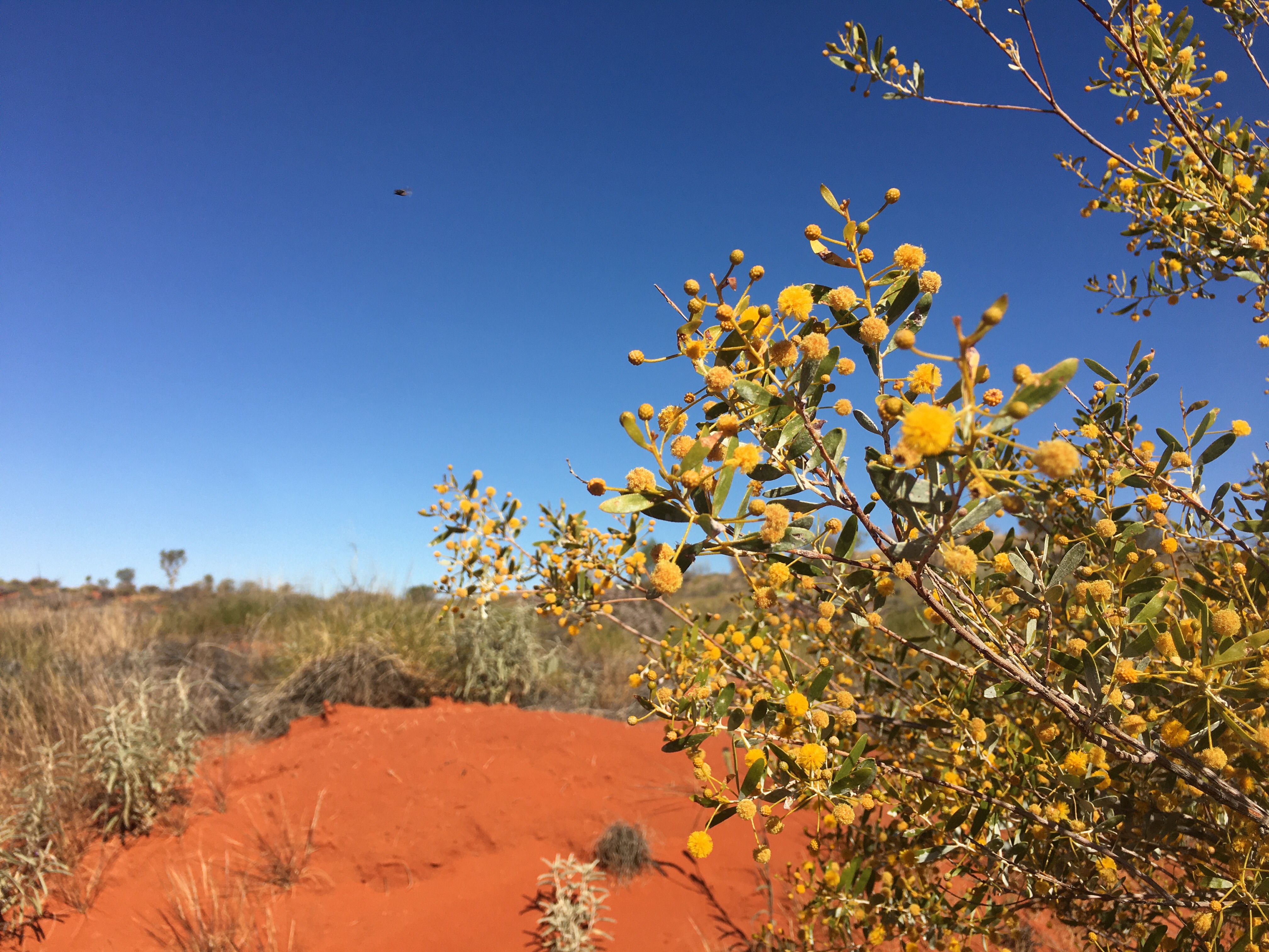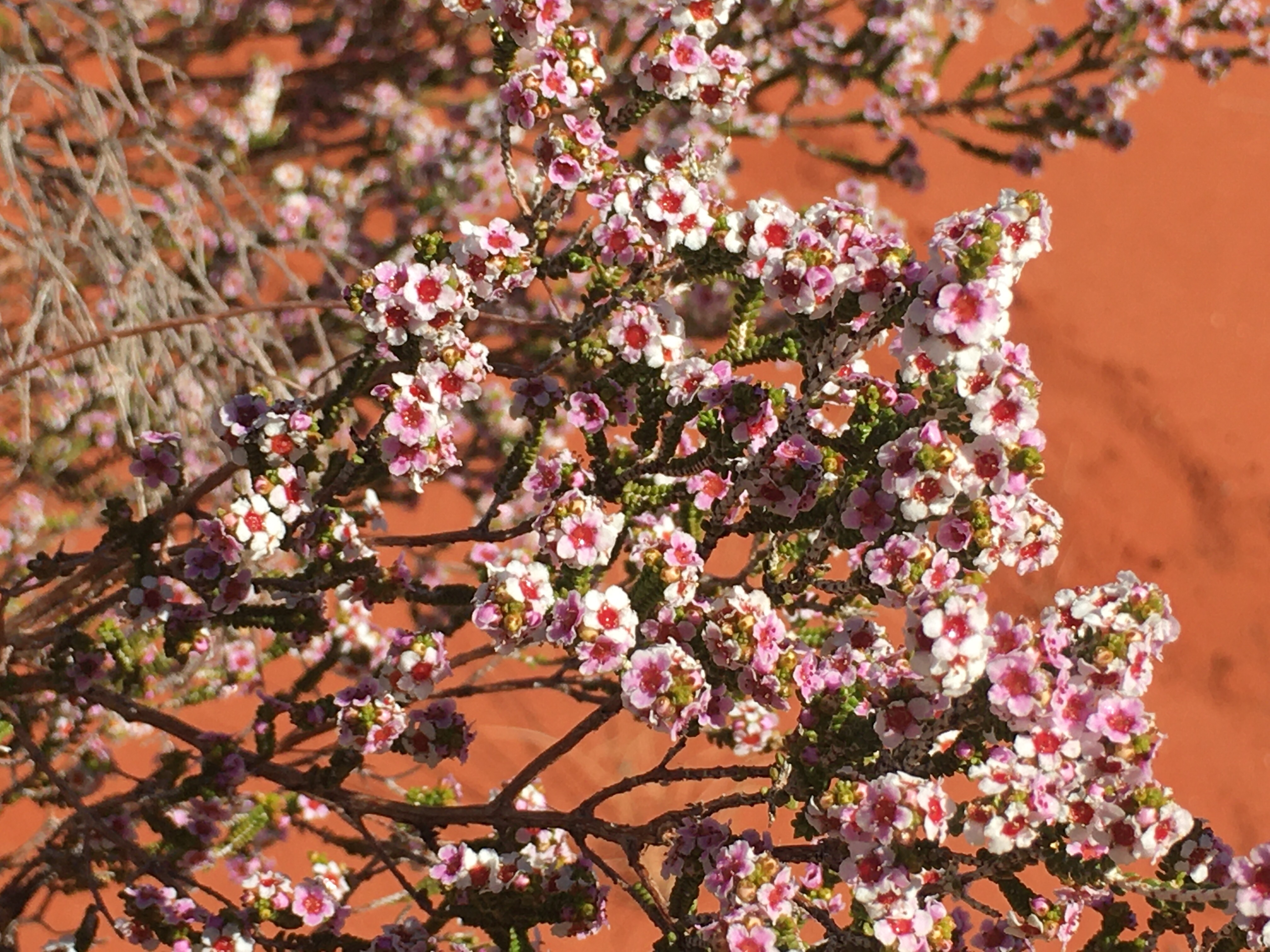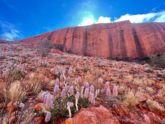 The landscape was breathtaking. It’s represented by scrub plains of sand dunes, spinifex, desert oaks and mulga trees. Apparently we might spot hill kangaroo amongst the rocks. Creek bds at the foot of the Olgas support other trees that need more water like large eucalypts. New species of plants were spotted some of which we were introduced to during our nature talk yesterday. The honey grevilia is used to sweeten drinks like a cordial and the flowers are spear shaped in vivid orange and yellow. I also noticed a small ground bush that has striking red tulips flowering around its base; so bizarre. It’s called an ‘upside down plant’ for obvious reasons. The mature and juvenile desert oaks are the main specimen of trees. The juvenile is an elongated bush with spiked leaves pointing downwards to divert rainwater to its roots. It stays in this form until the roots reach the water table to support the tree in its maturity. The mature tree is able to store water in its branches and roots in the arid conditions.